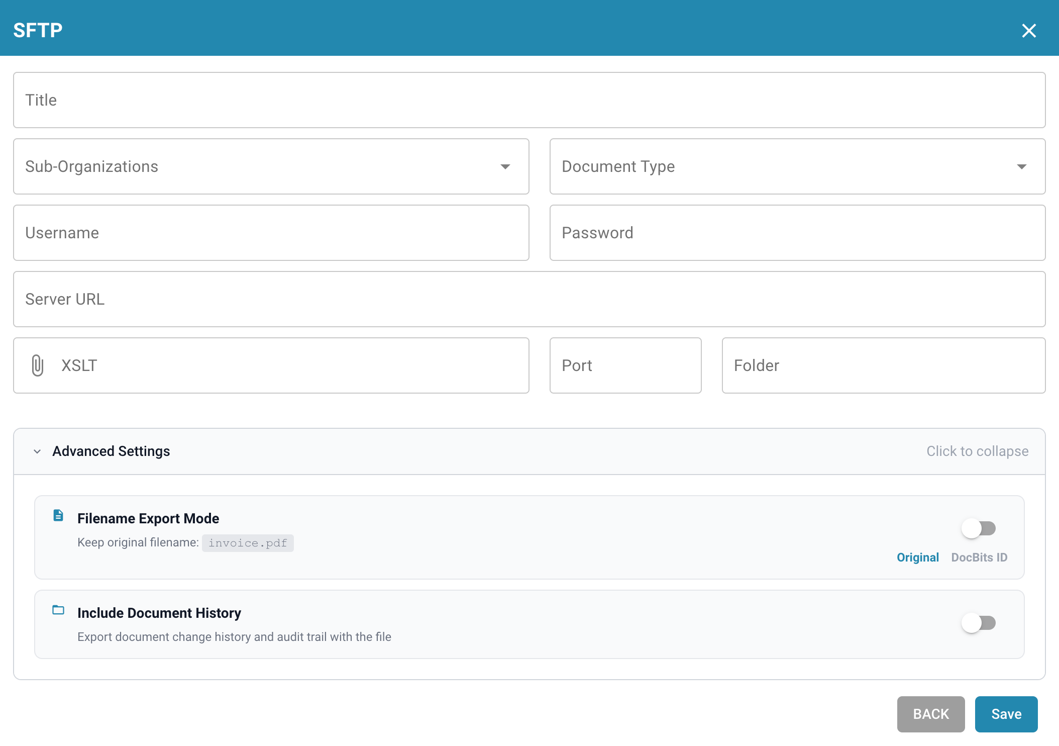 • Folder Il percorso sul server SFTP dove i documenti devono essere caricati (ad es. /incoming/invoices/). Deve esistere ed essere scrivibile.