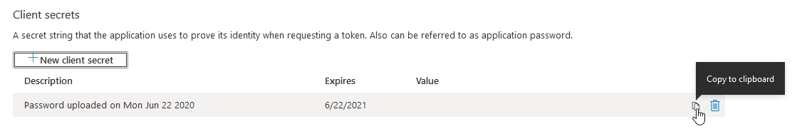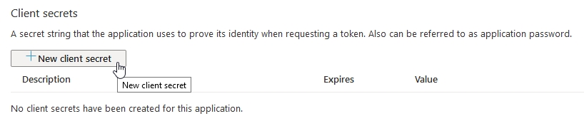 Nella schermata Certificates & secrets, fare clic sul pulsante + New client secret nella sezione Client secrets: