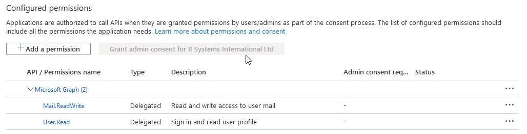 Questo aggiungerà l'autorizzazione Mail.ReadWrite all'elenco delle Configured permissions per l'App.