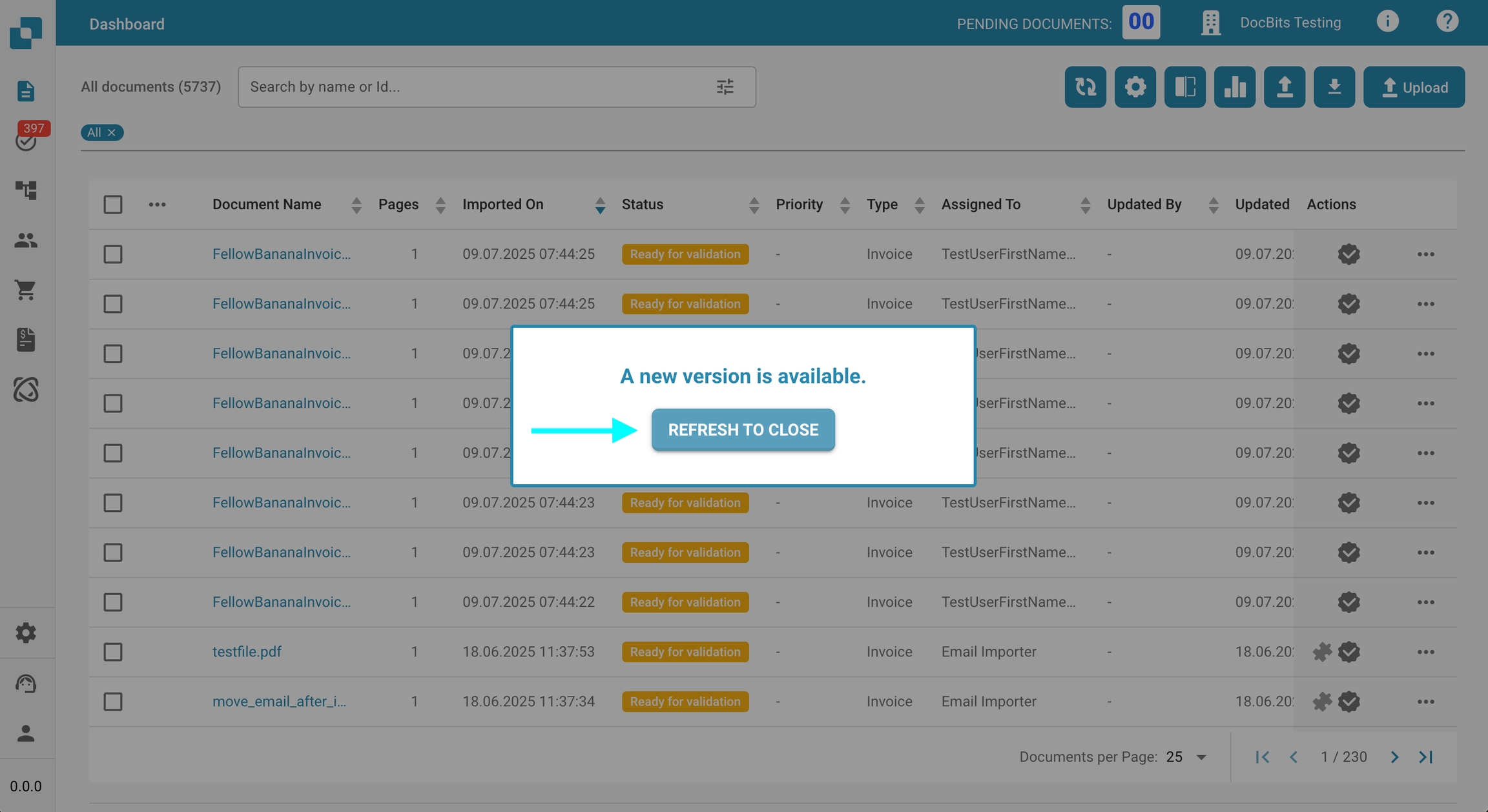 Fai clic su Aggiorna per chiudere nella finestra di dialogo. DocBits si ricaricherà e si aprirà con l'ultima versione. Questo assicura che gli utenti stiano sempre lavorando con le funzionalità, i miglioramenti e le correzioni di bug più recenti.
