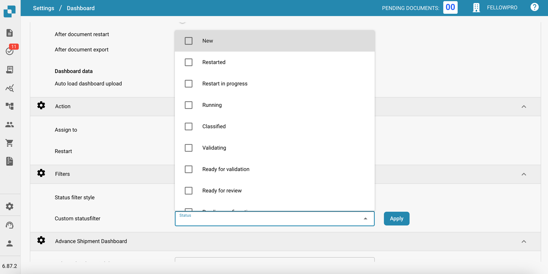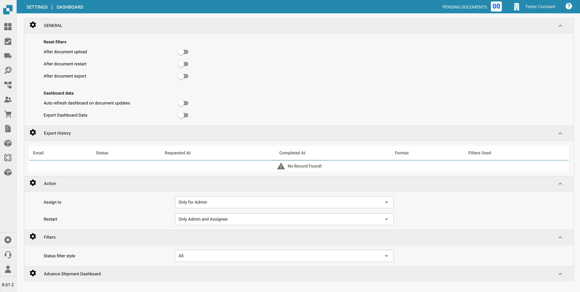 Azzeramento dei filtri: Consente di configurare quando i filtri del cruscotto devono essere azzerati, ad esempio dopo il caricamento di documenti, il riavvio di documenti o l'esportazione di documenti. Questo aiuta a mantenere una visualizzazione pulita dei dati in base a specifiche fasi del flusso di lavoro.
