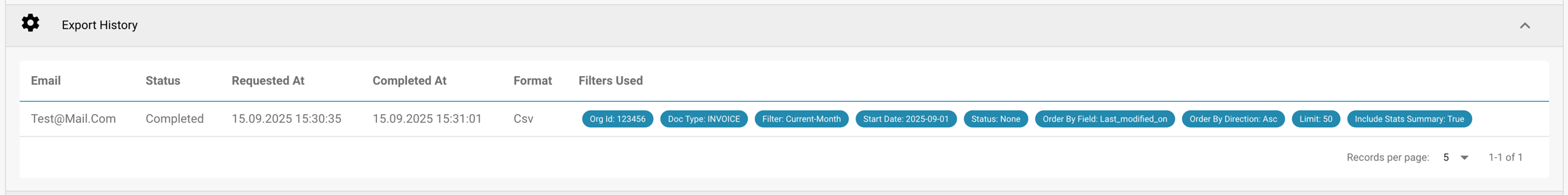 Nella Cronologia delle esportazioni, vedrai una tabella che elenca tutte le esportazioni passate insieme alle informazioni chiave su ciascuna richiesta.
