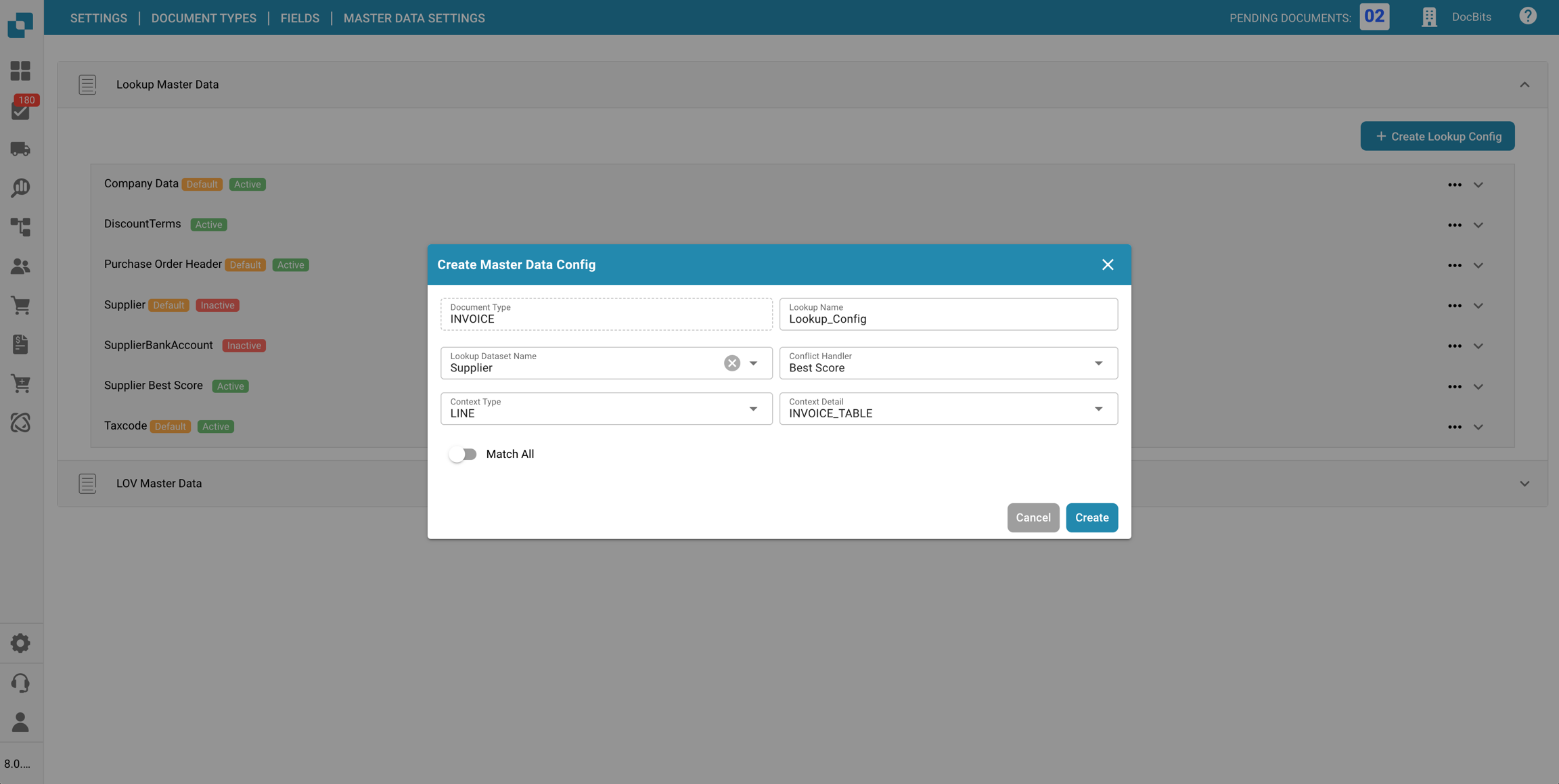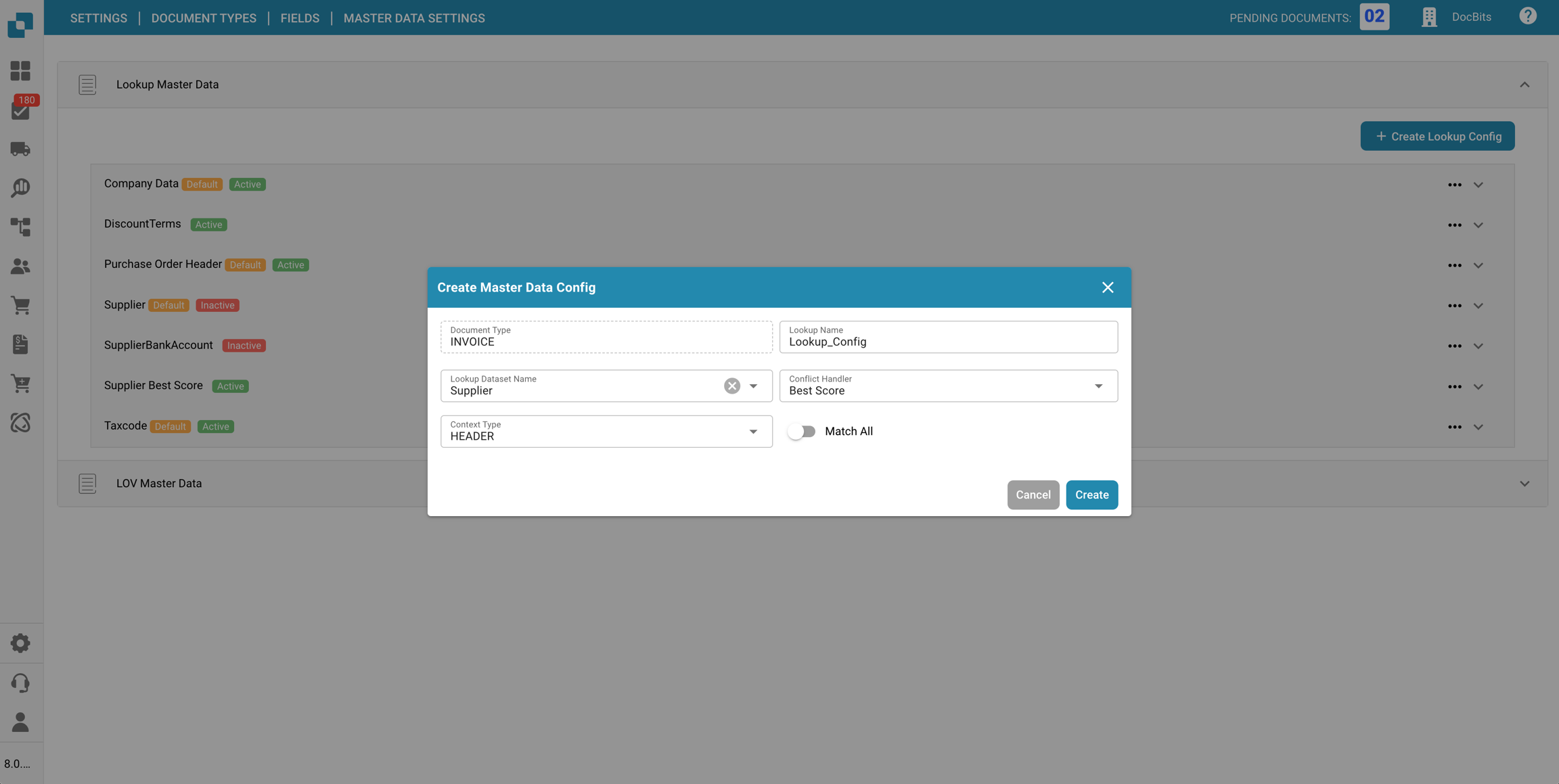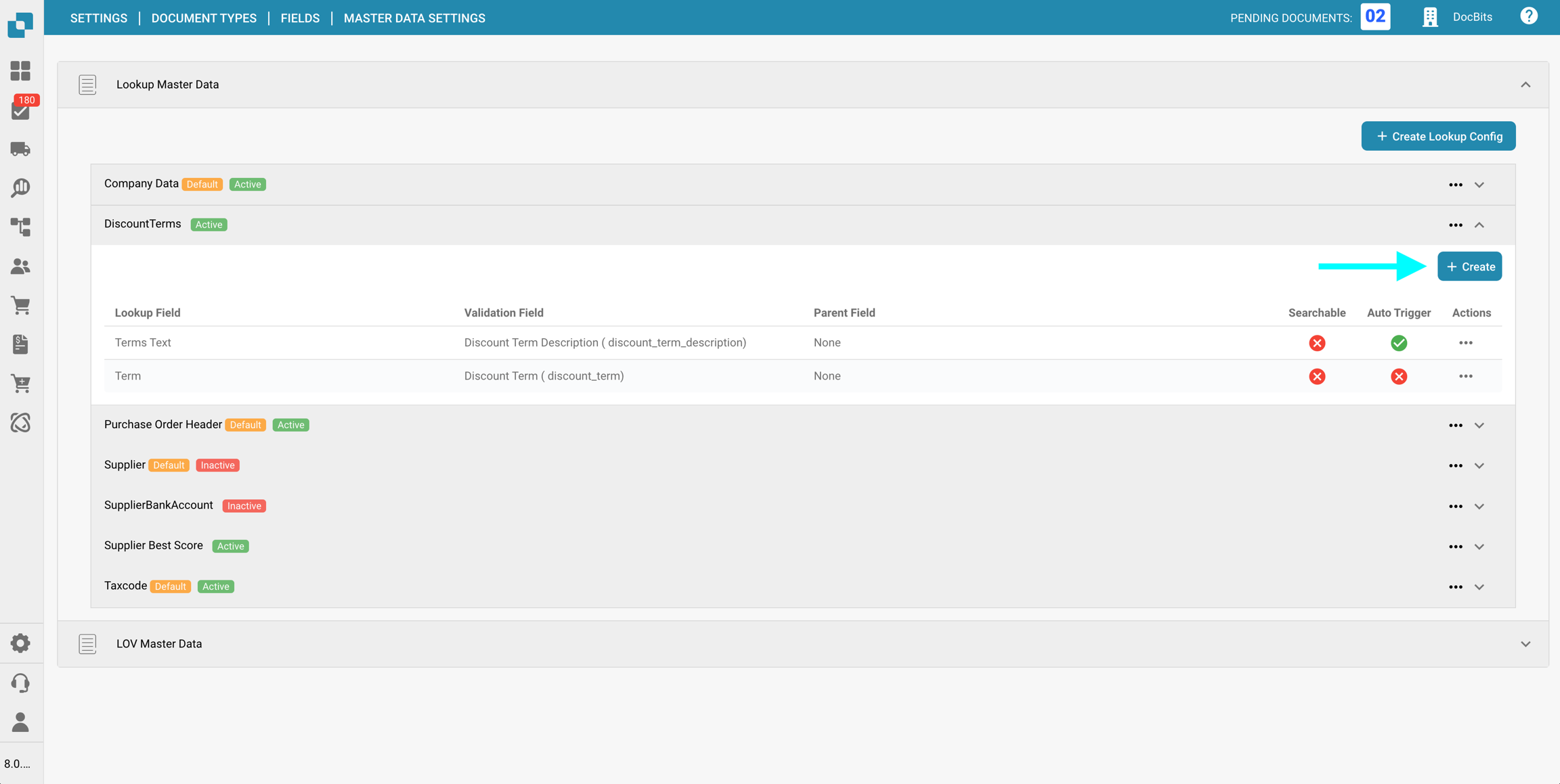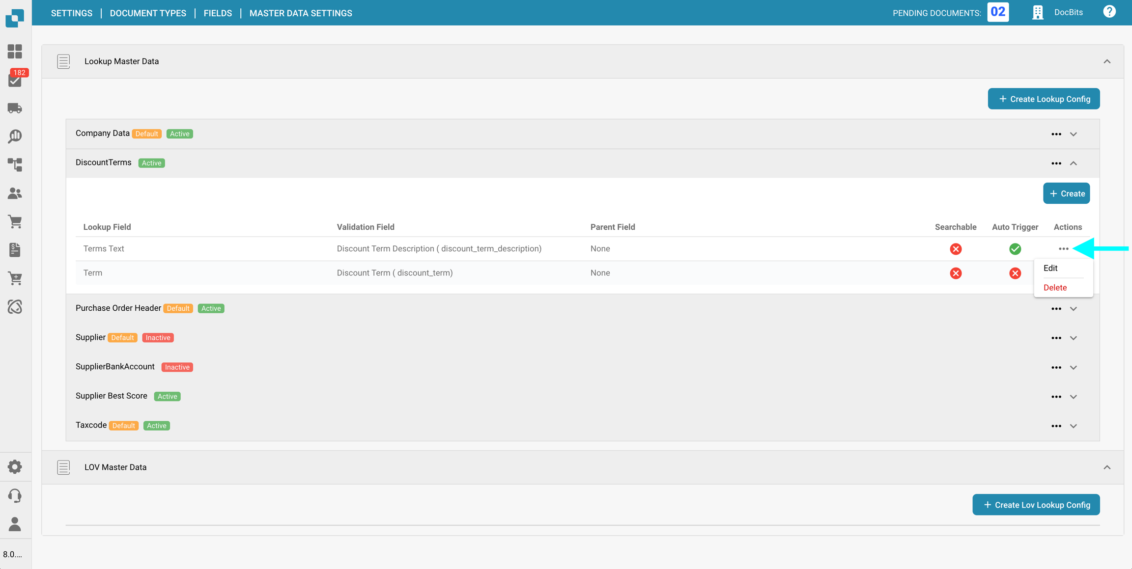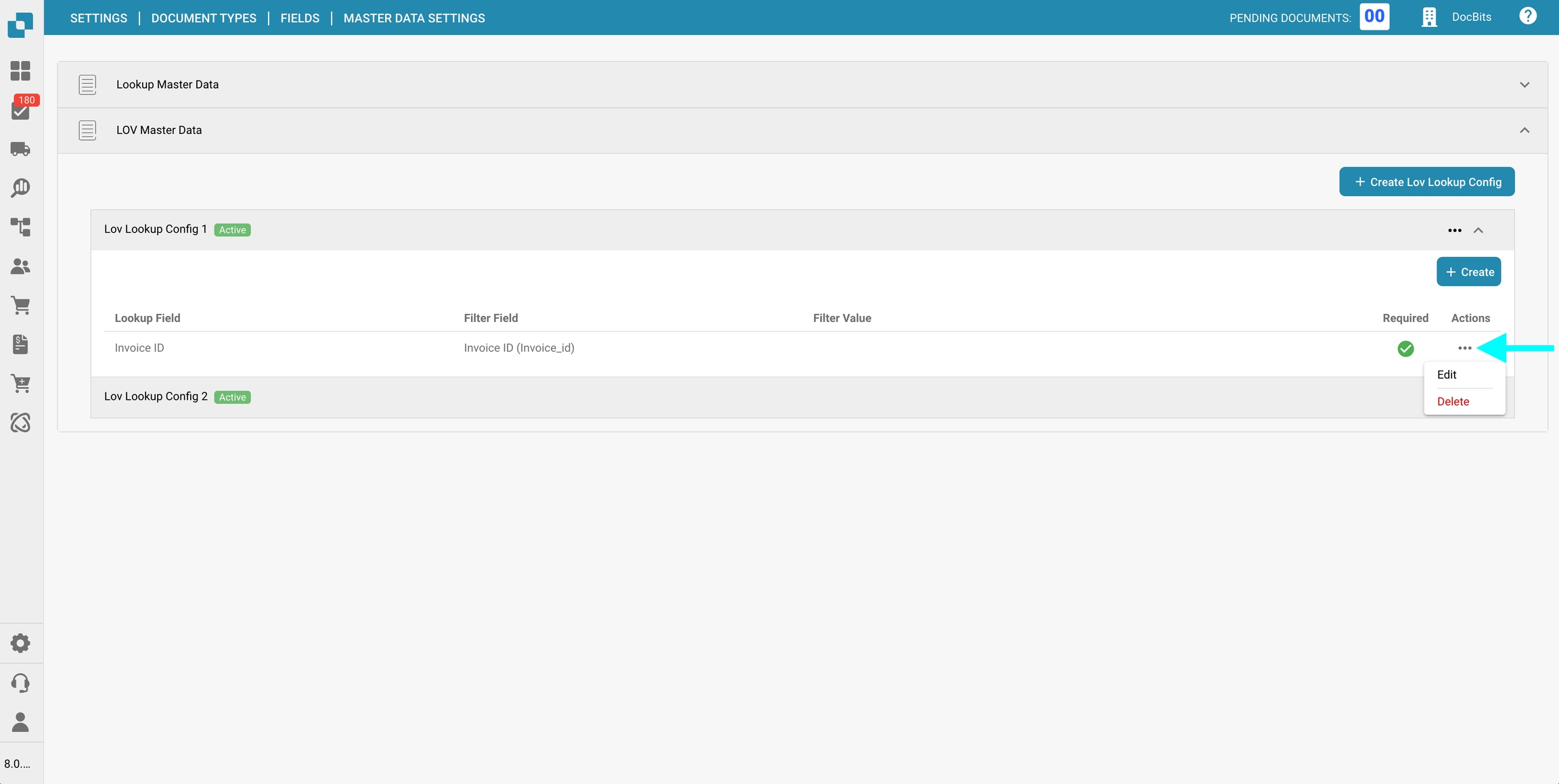 Nella sezione Impostazioni dei dati master delle Campi per un specifico Tipo di documento, puoi visualizzare e configurare le mappature dei dati master ai campi utilizzati nella convalida dei campi, utilizzando i dati dalla Ricerca dei dati master.