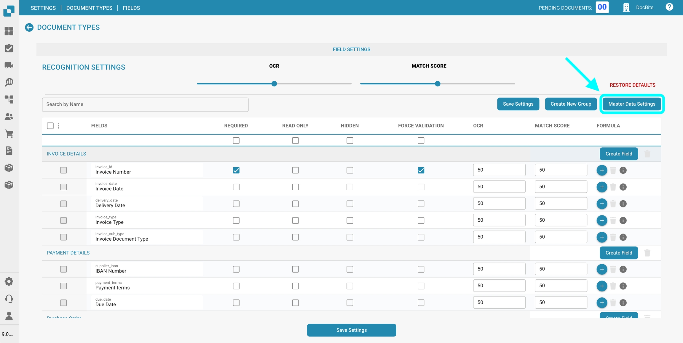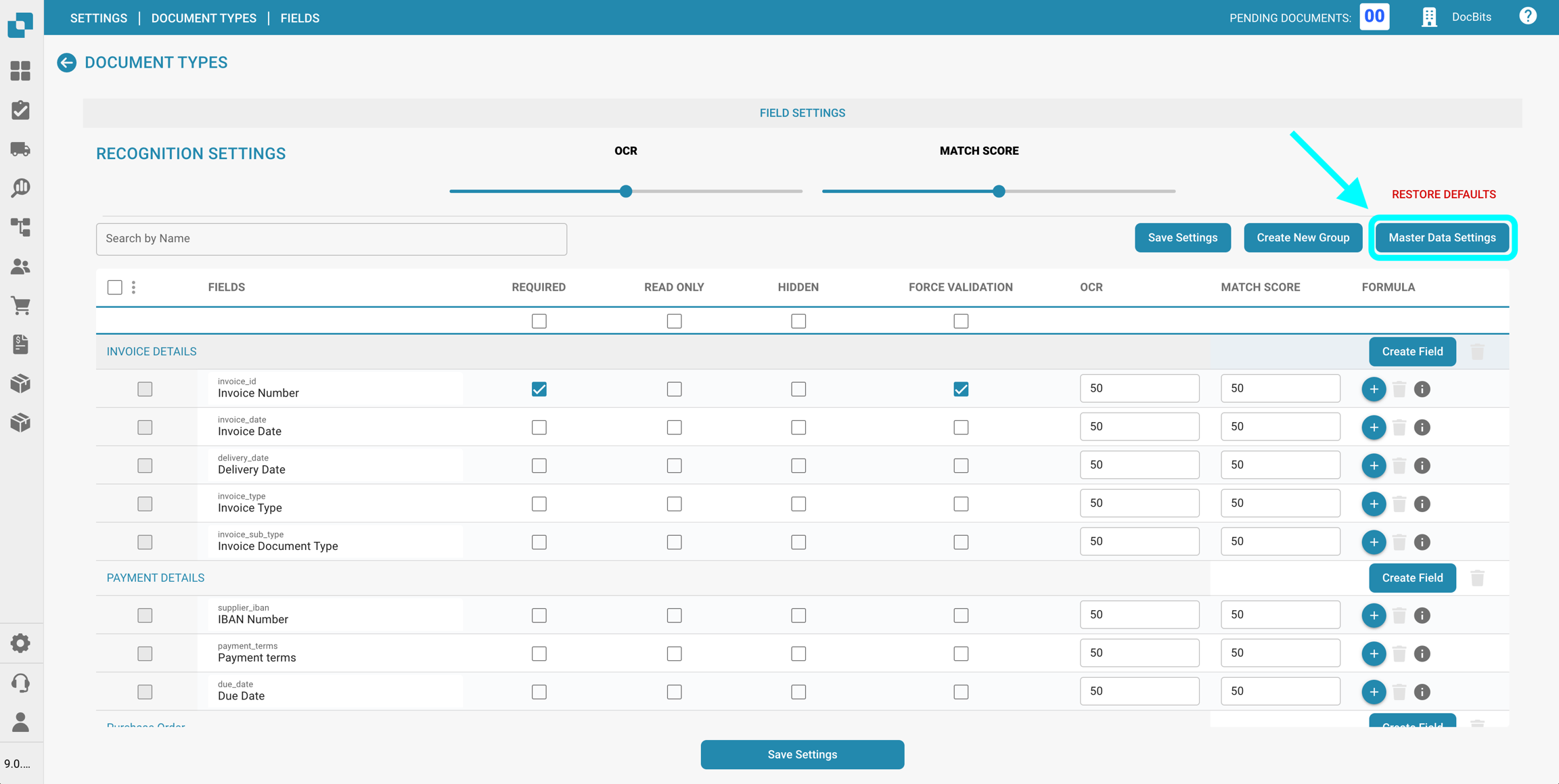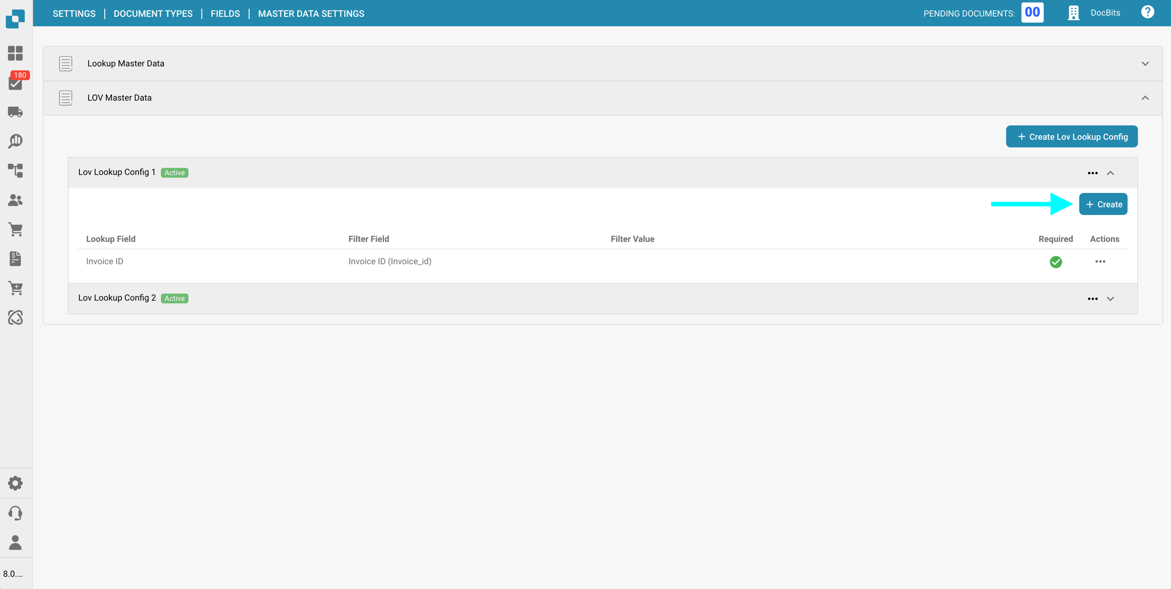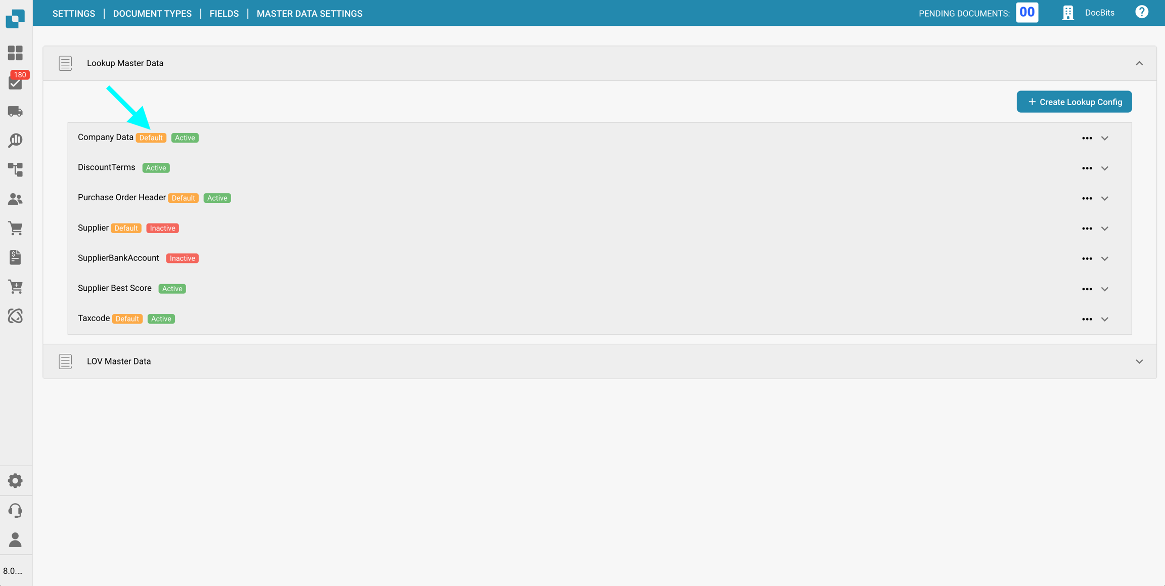 Nella sezione Impostazioni dei dati master delle Campi per un specifico Tipo di documento, puoi visualizzare e configurare le mappature dei dati master ai campi utilizzati nella convalida dei campi, utilizzando i dati dalla Ricerca dei dati master.