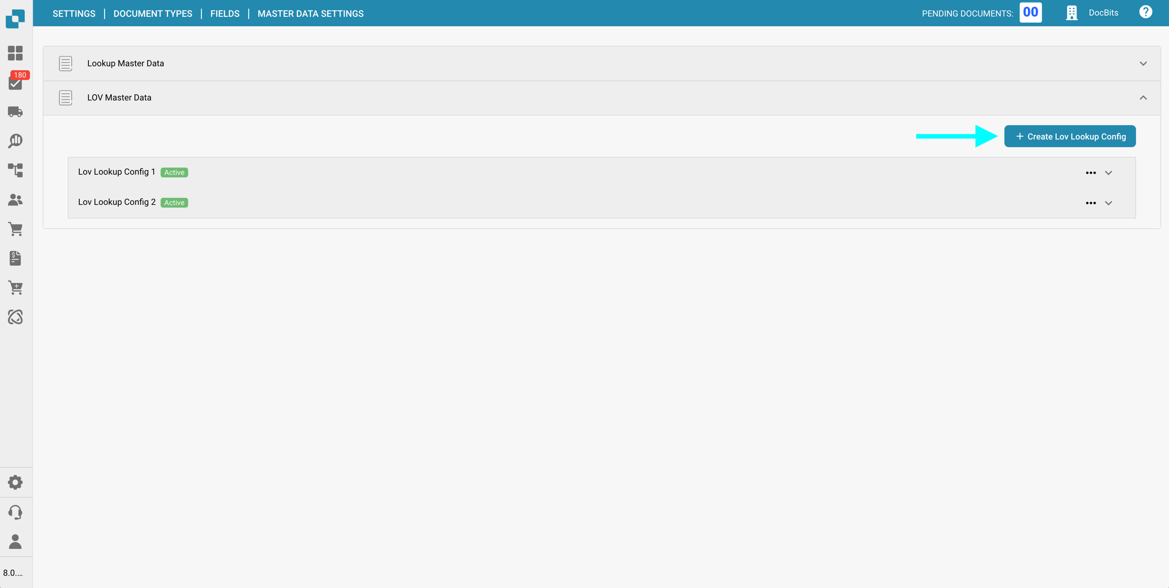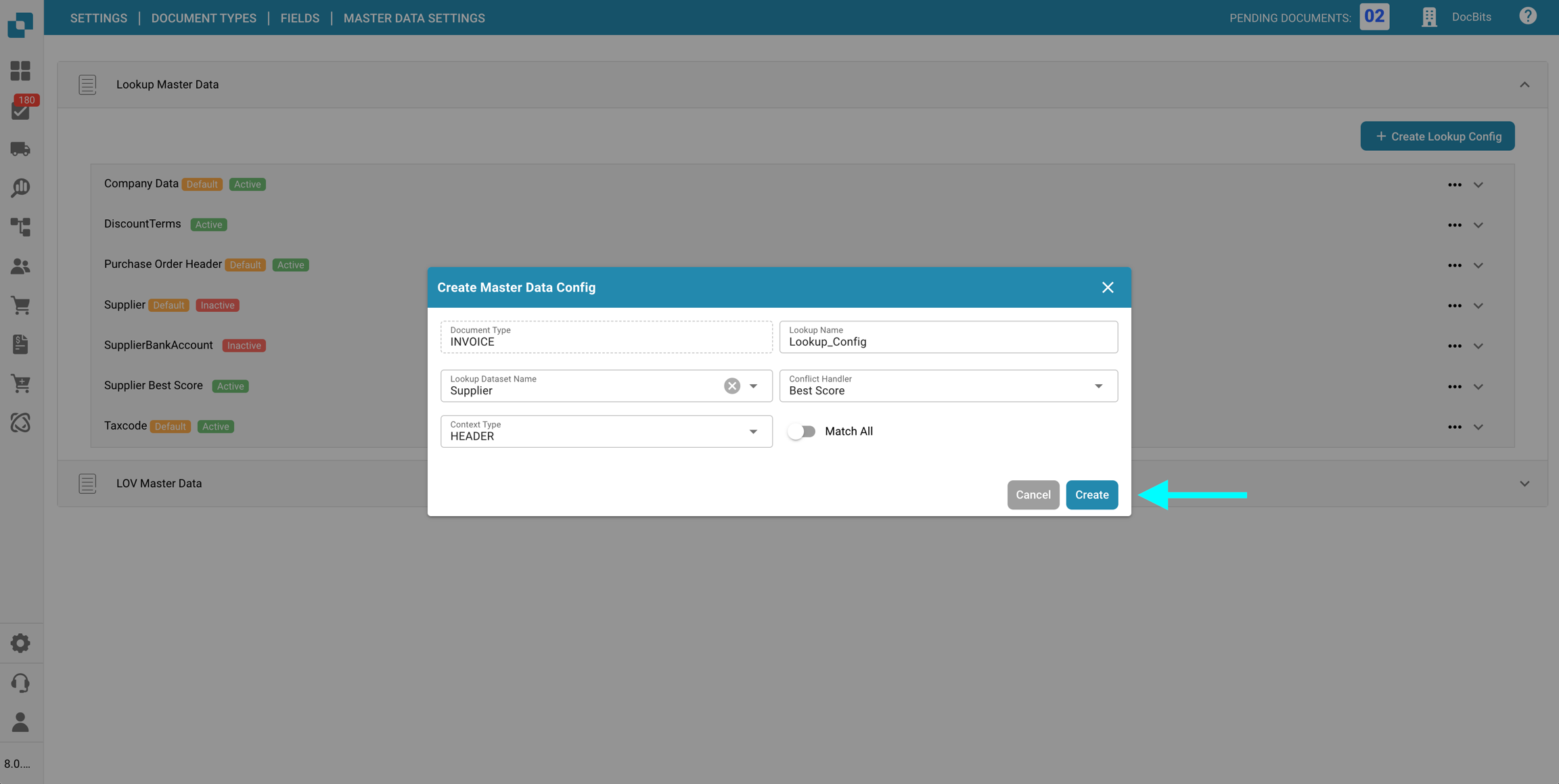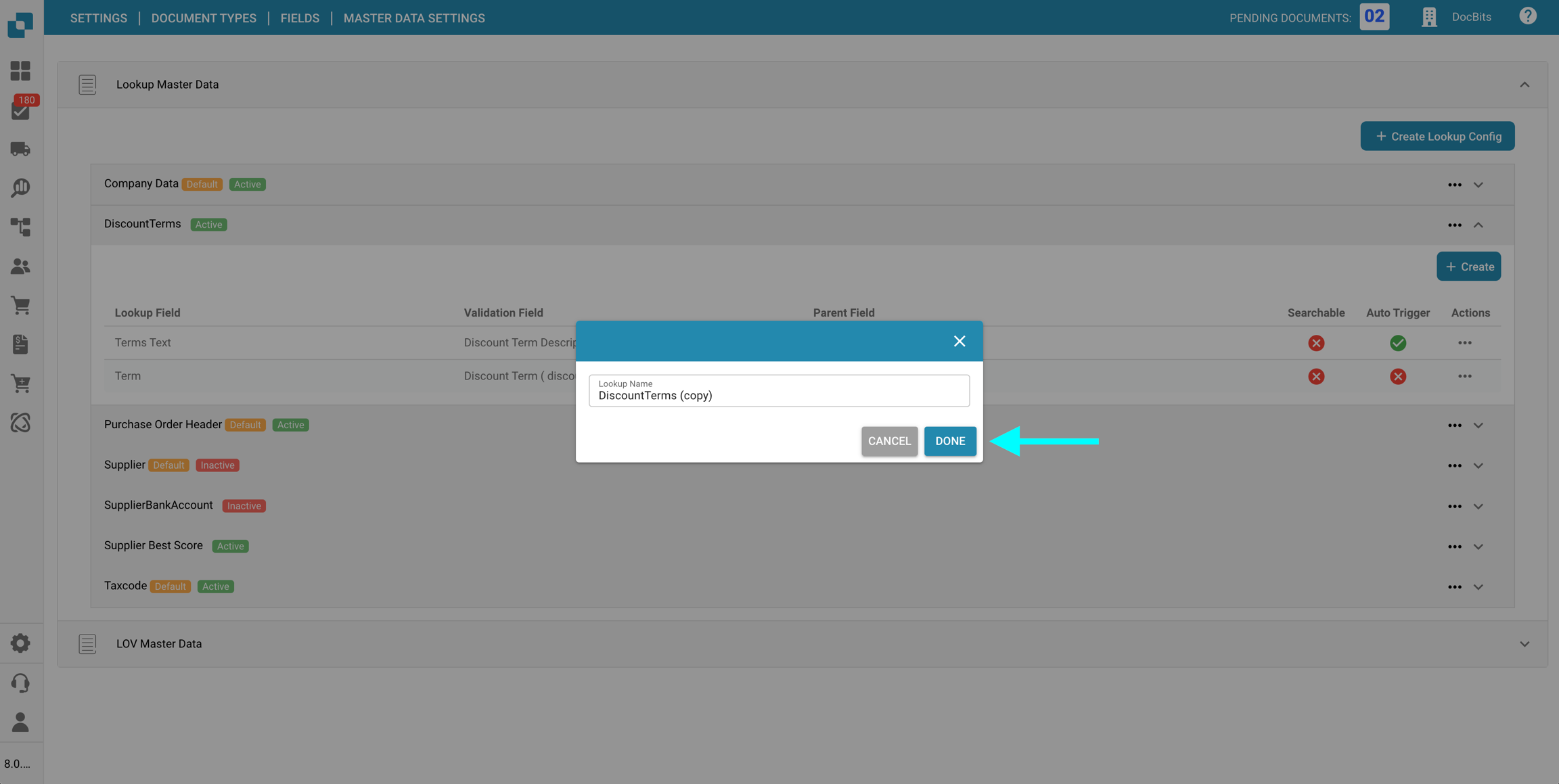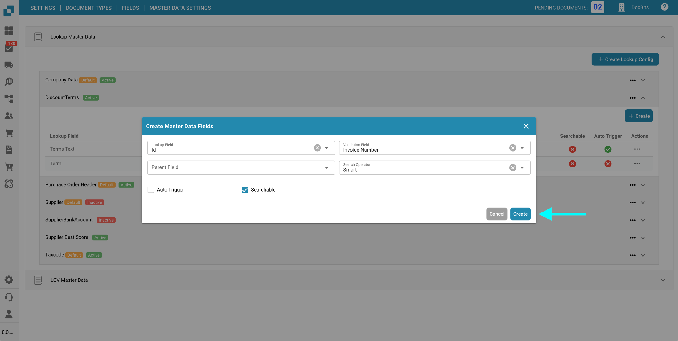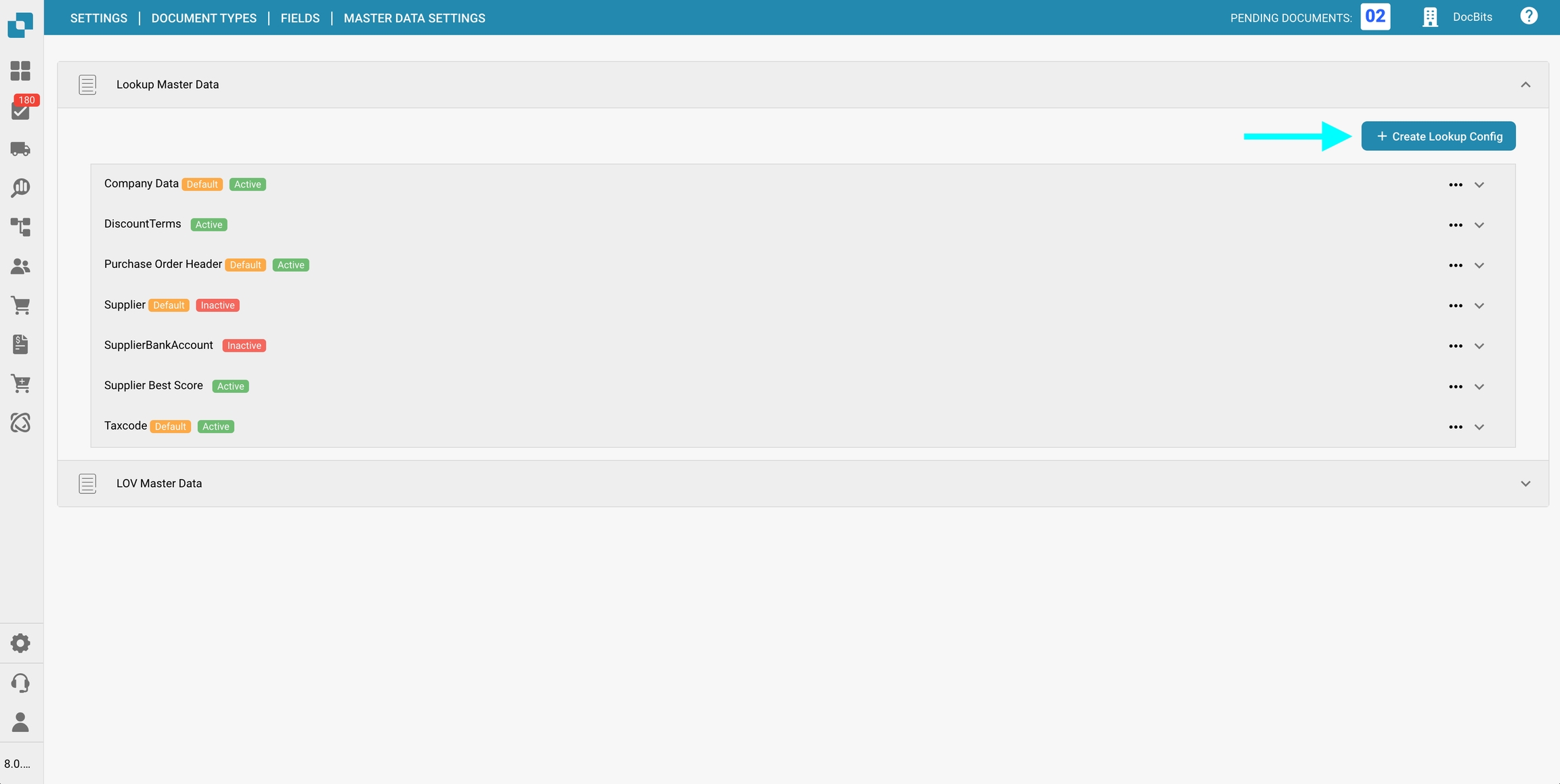 Nella sezione Impostazioni dei dati master delle Campi per un specifico Tipo di documento, puoi visualizzare e configurare le mappature dei dati master ai campi utilizzati nella convalida dei campi, utilizzando i dati dalla Ricerca dei dati master.
