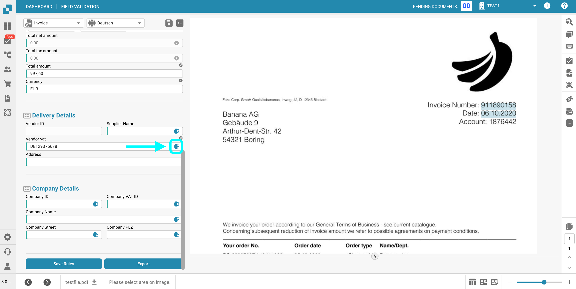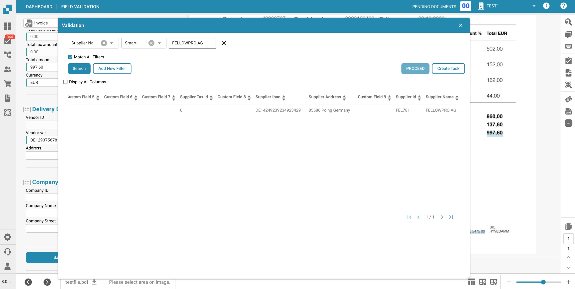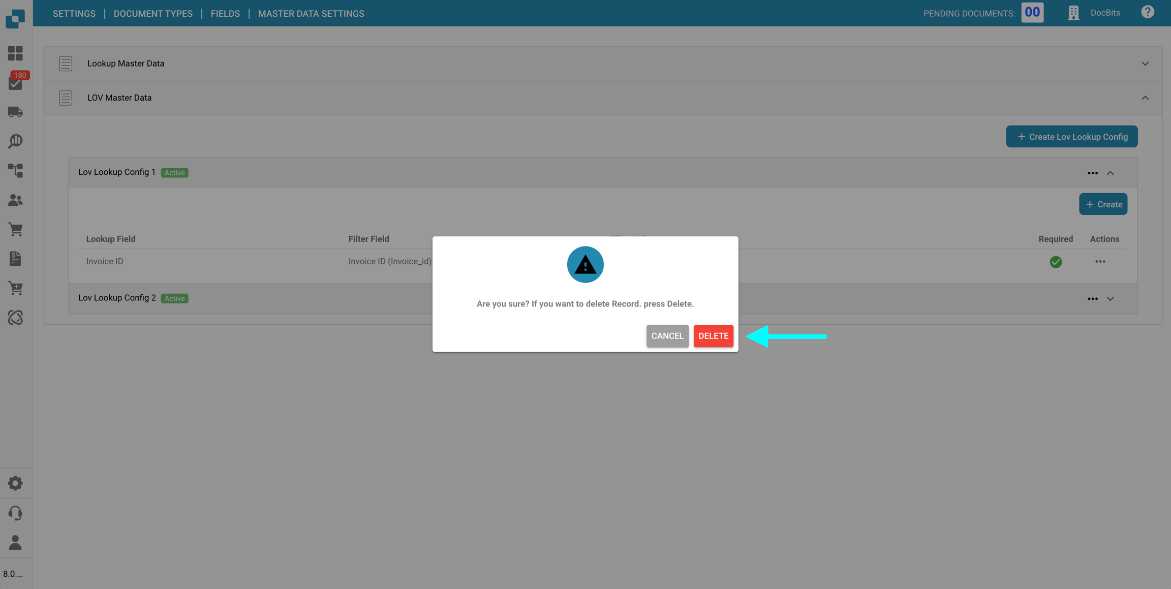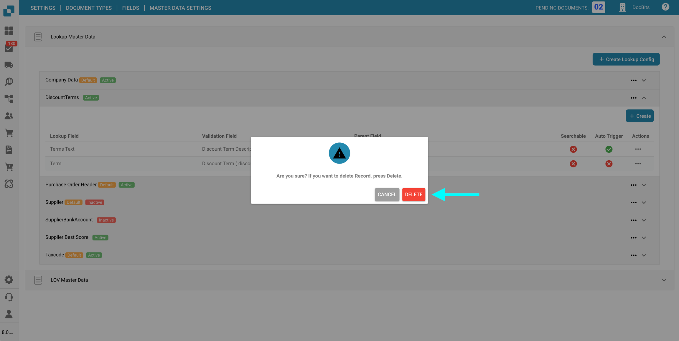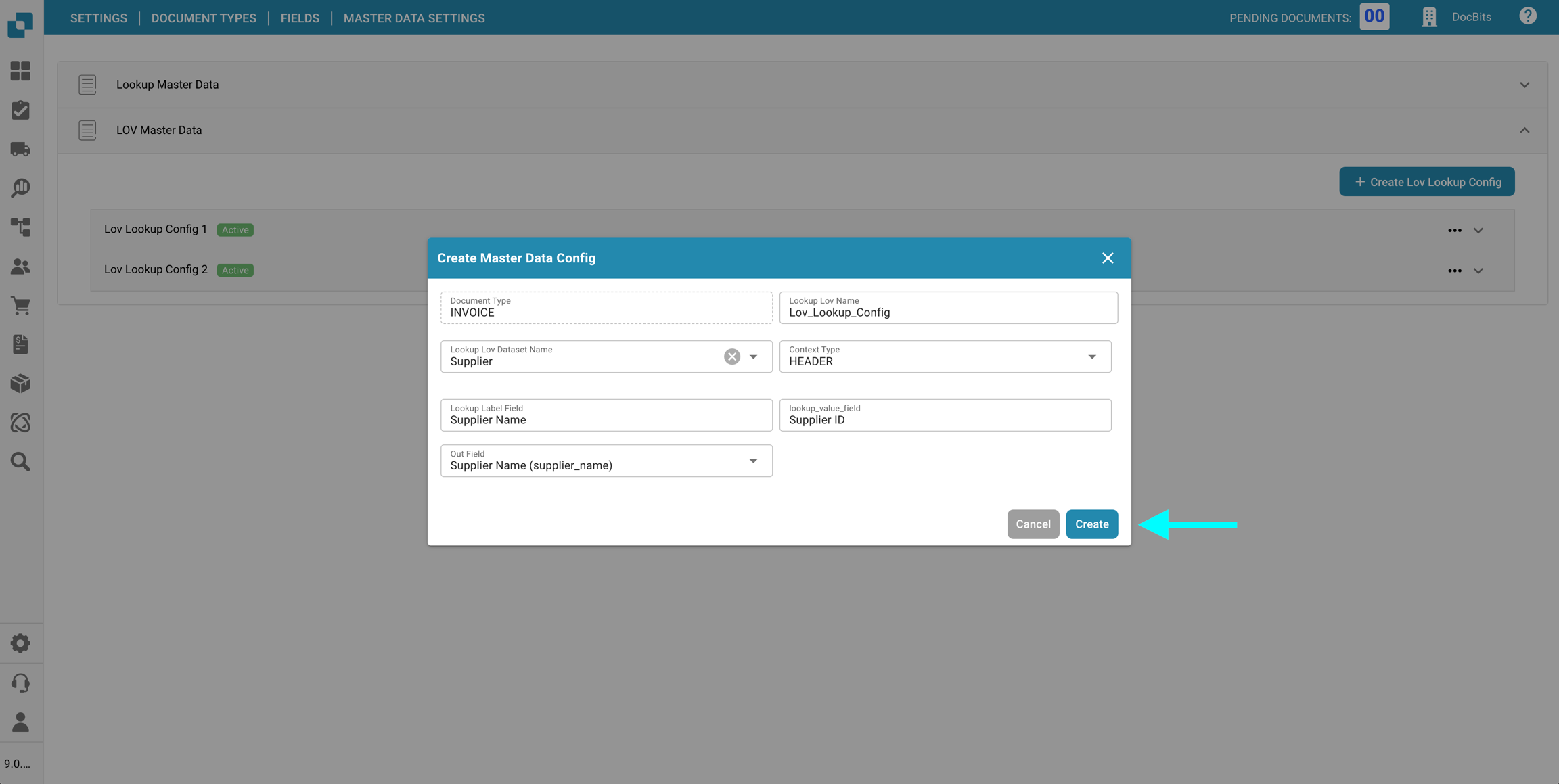 Nella sezione Impostazioni dei dati master delle Campi per un specifico Tipo di documento, puoi visualizzare e configurare le mappature dei dati master ai campi utilizzati nella convalida dei campi, utilizzando i dati dalla Ricerca dei dati master.