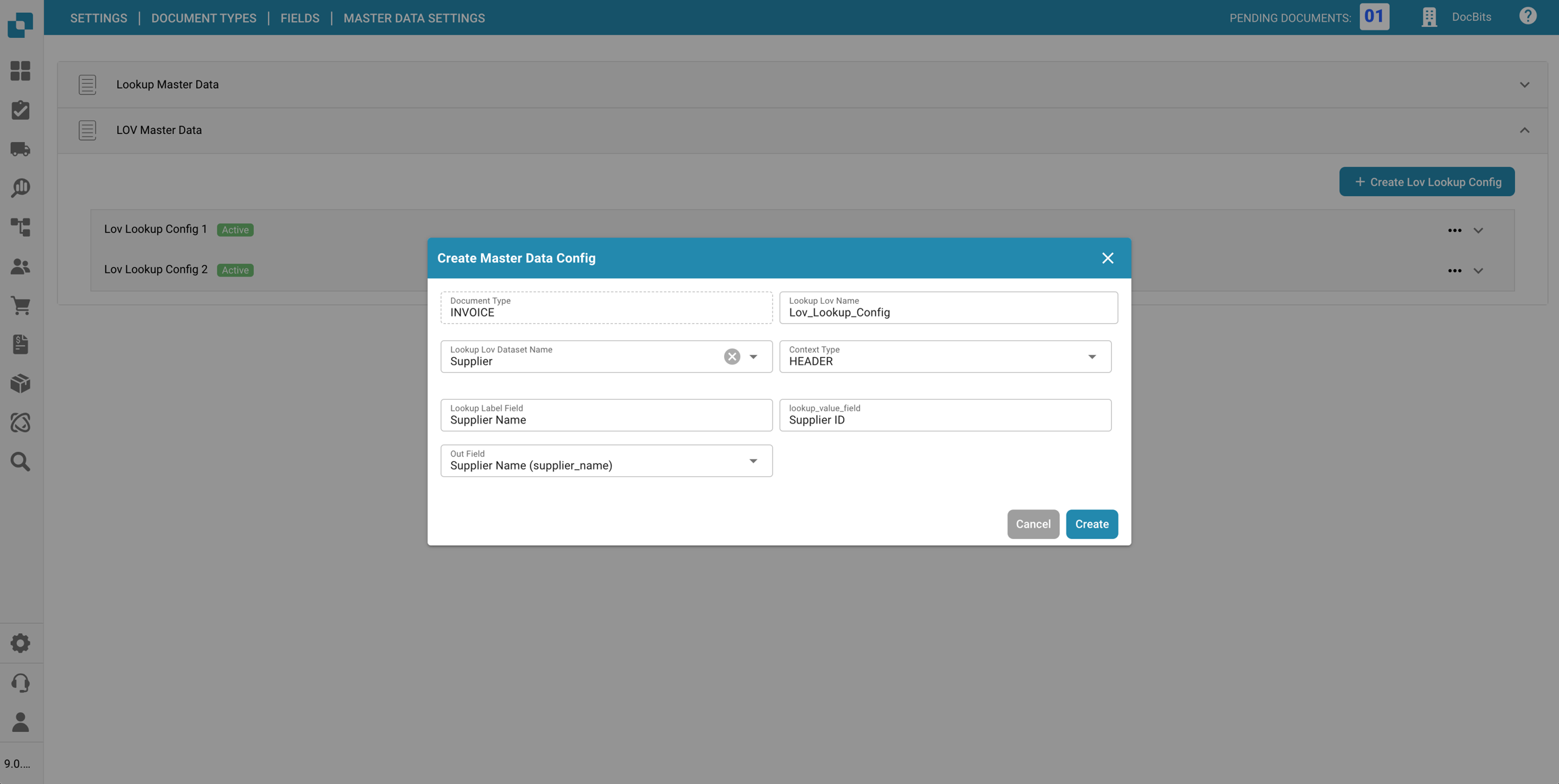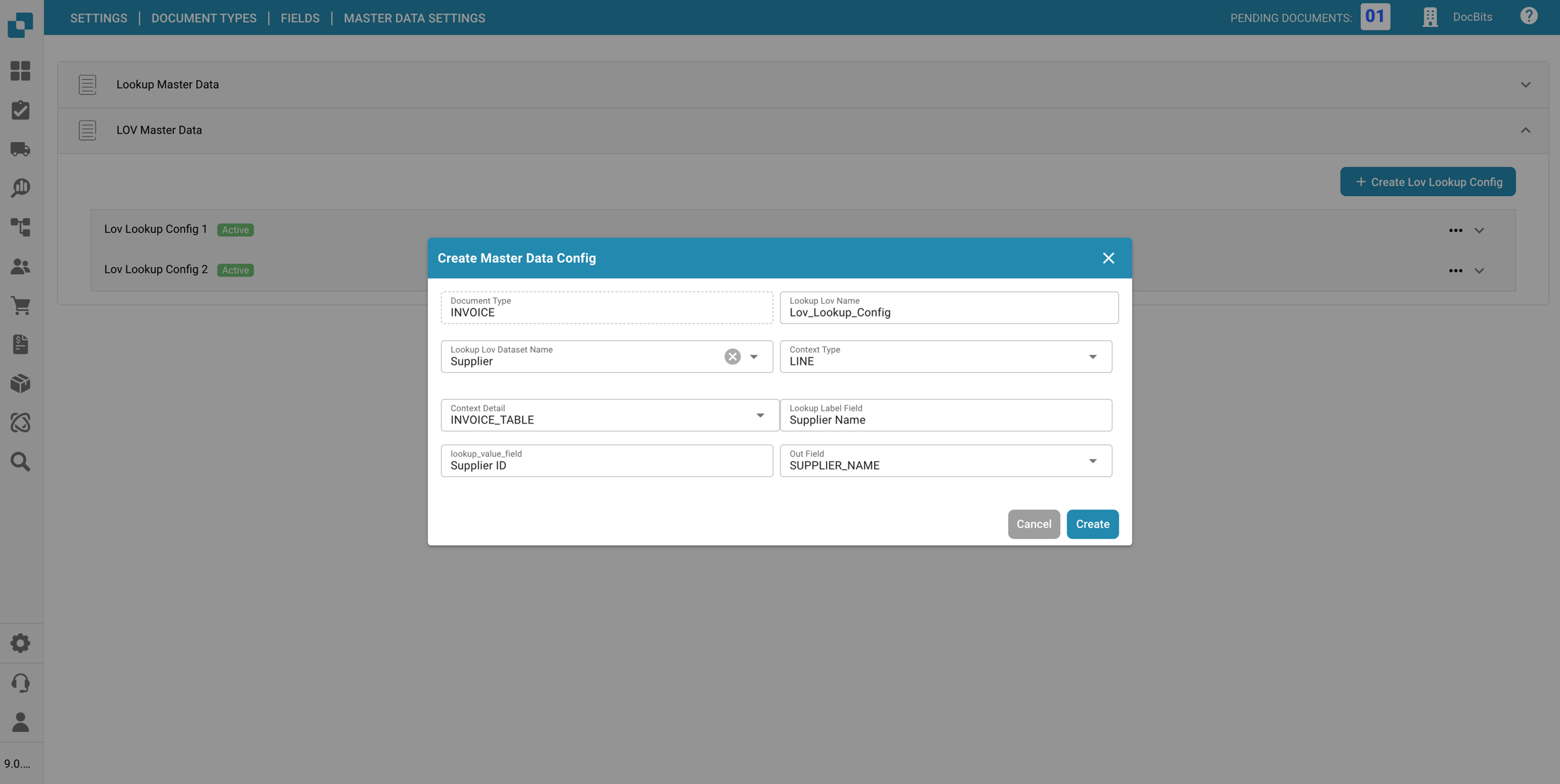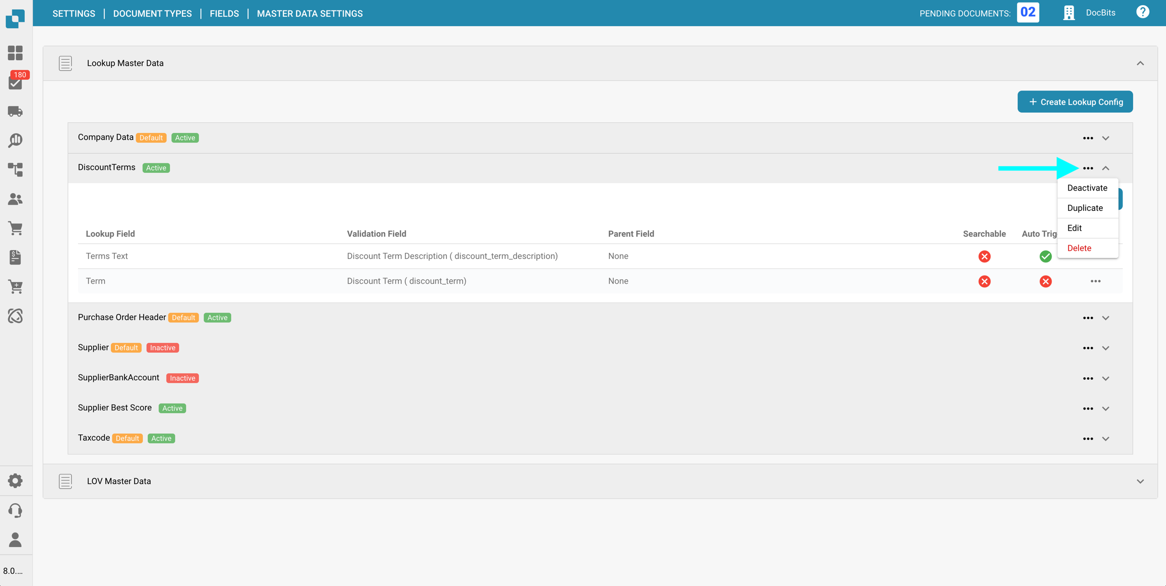Una configurazione di ricerca lov definisce come le opzioni del dropdown sono ottenute da una tabella di dati master e come quei valori vengono mostrati e inseriti nei campi del documento.