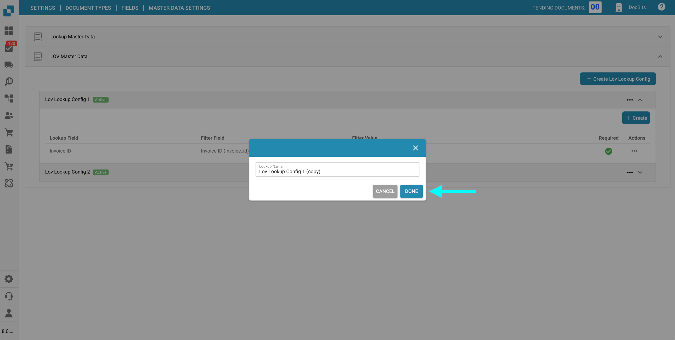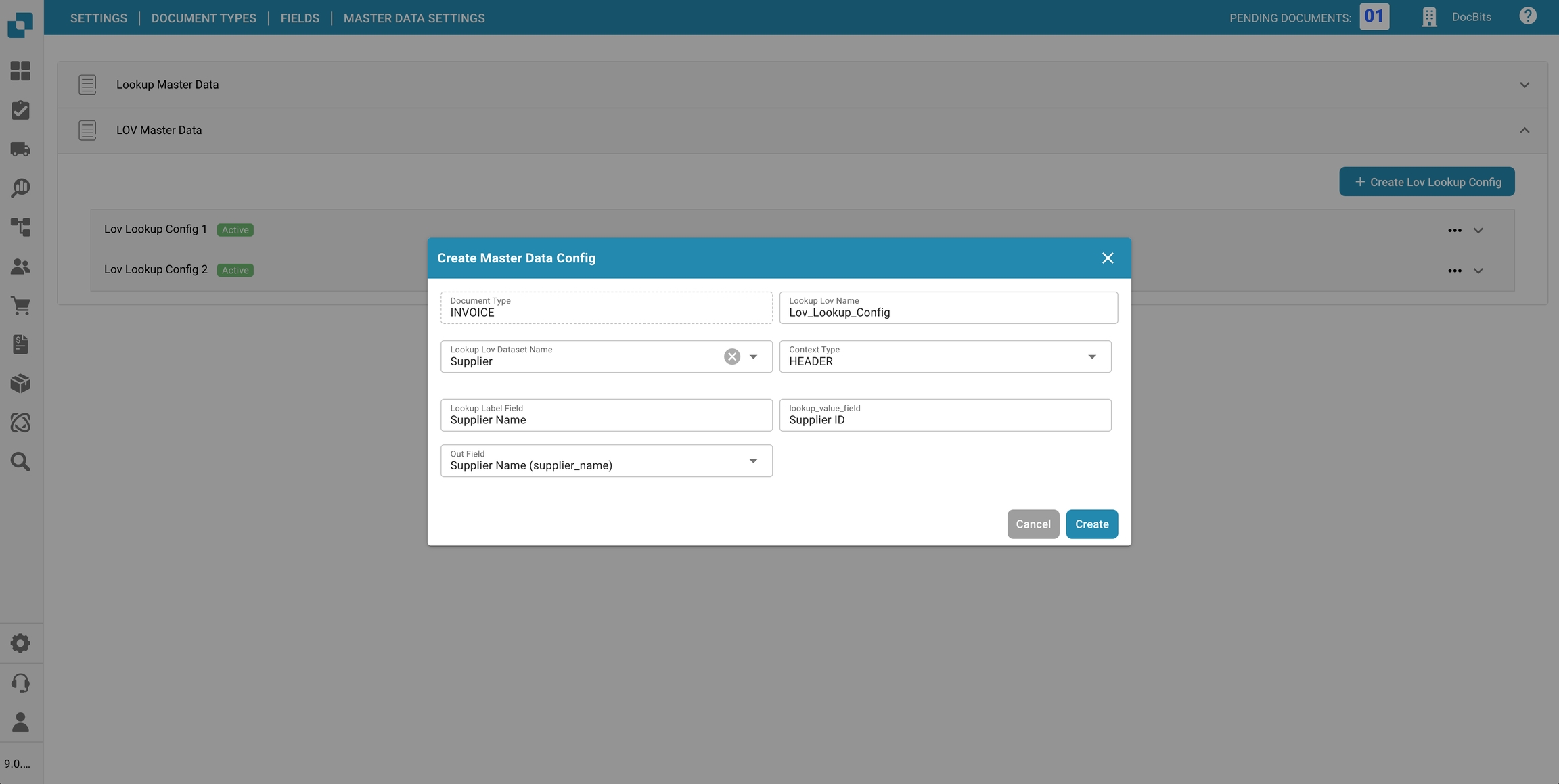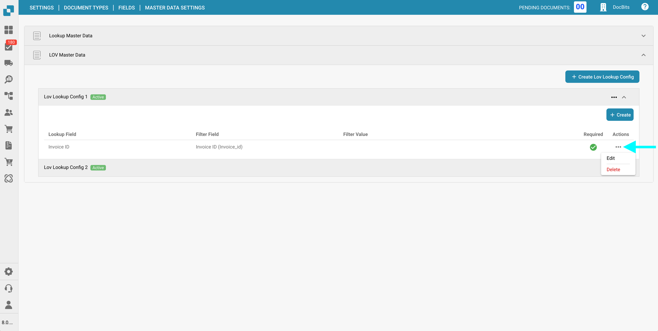 Una configurazione di ricerca lov definisce come le opzioni del dropdown sono ottenute da una tabella di dati master e come quei valori vengono mostrati e inseriti nei campi del documento.