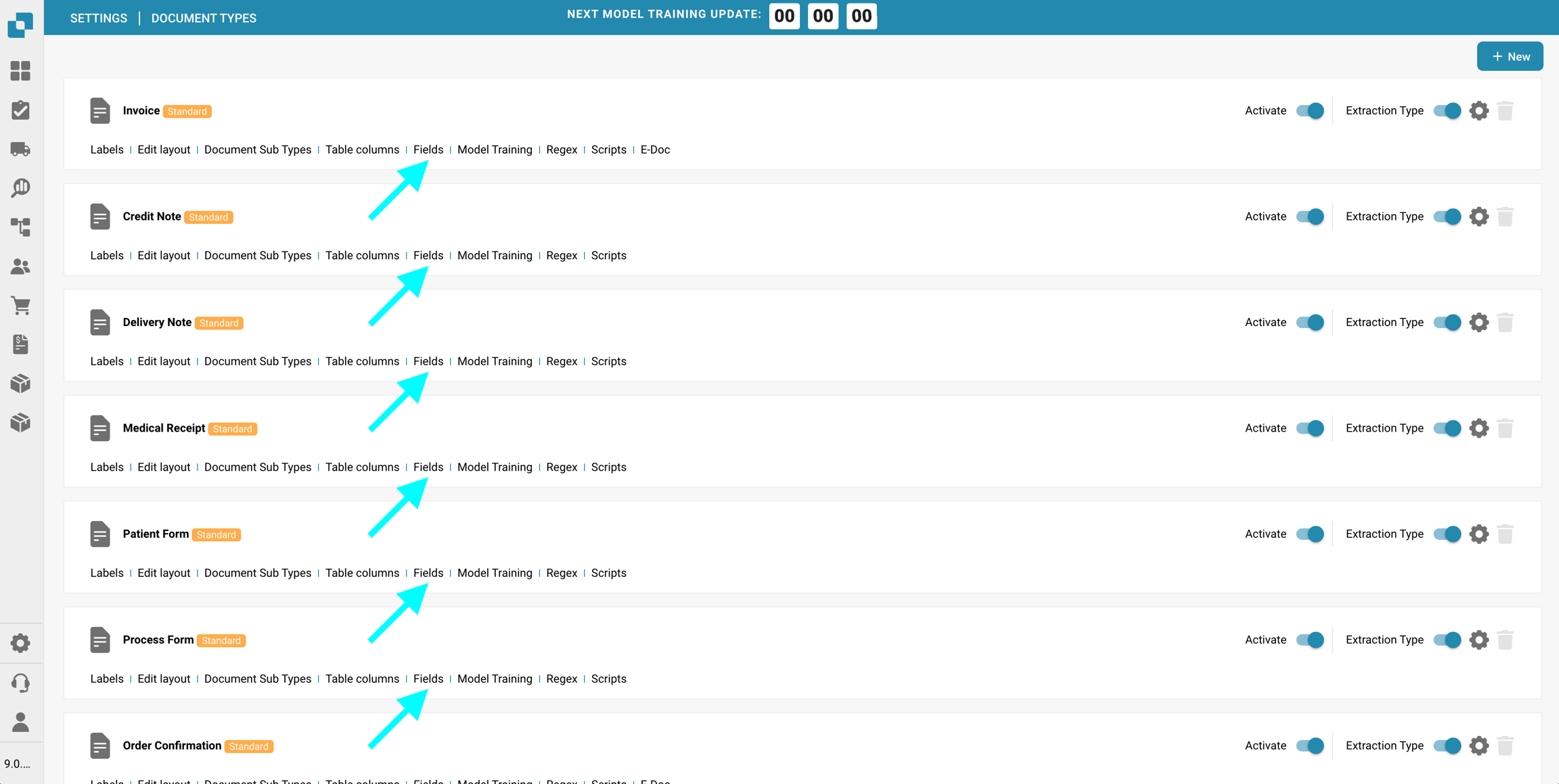 Seleziona il Tipo di documento desiderato e clic su Campi.