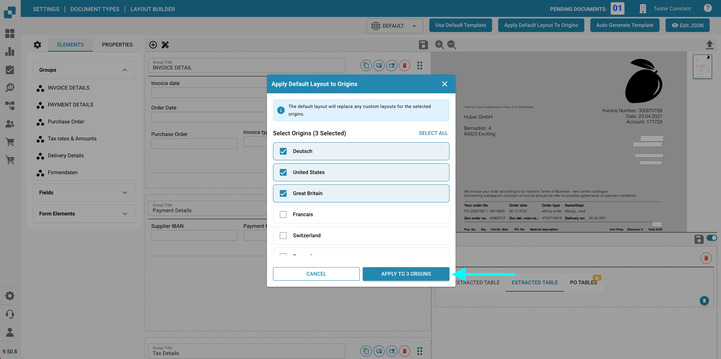 Selezionare l'Origin Layout: Nel Layout Builder, scegli il layout di base corrispondente all'origine del documento.