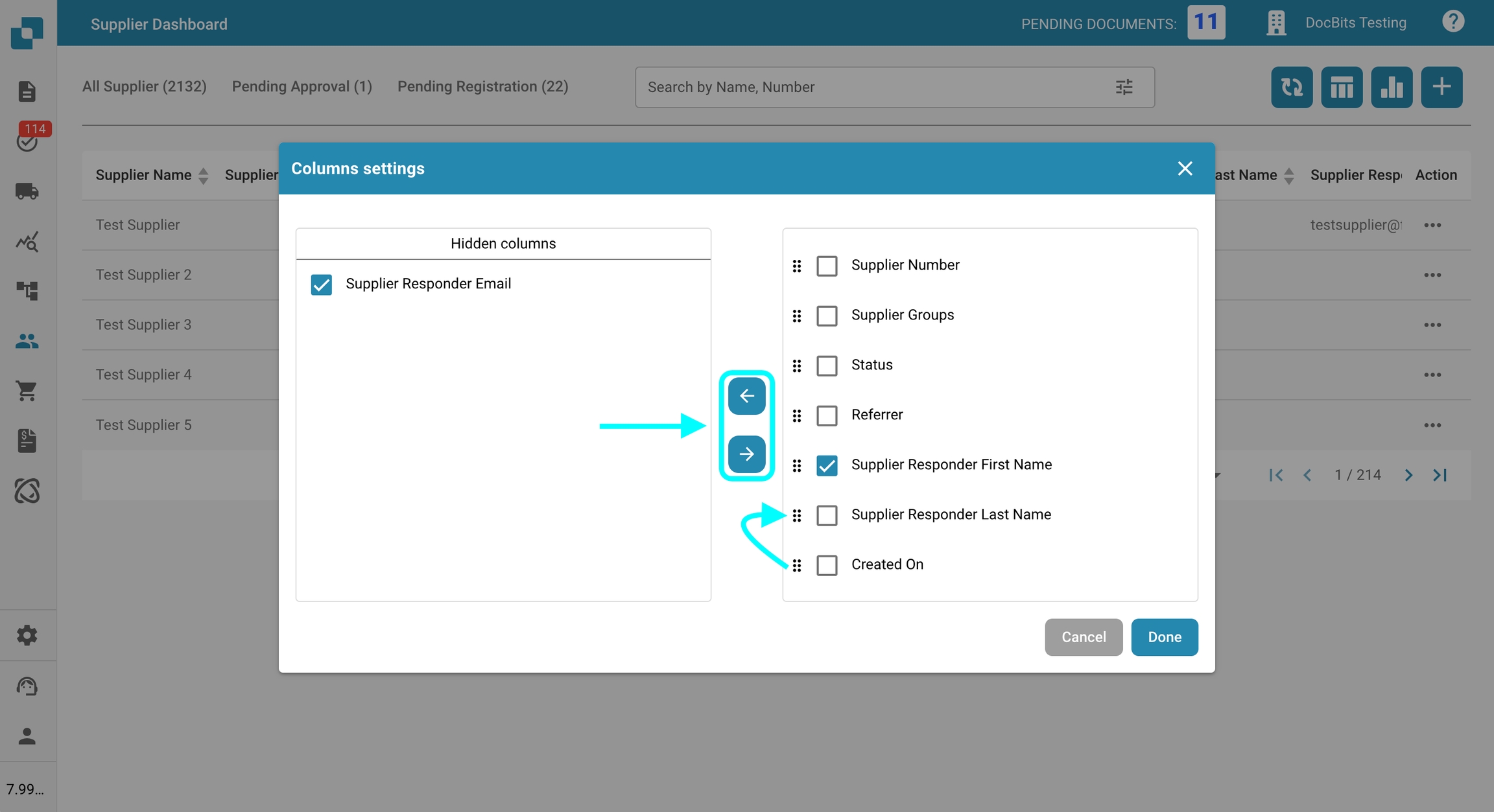 Fai clic su questo pulsante per aprire un menu in cui puoi gestire la visibilità delle colonne nella tabella degli ordini di acquisto. Usa le caselle di controllo e i pulsanti a freccia per spostare le colonne tra le sezioni visibili e nascoste. Puoi anche riordinare le colonne trascinando e rilasciando i nomi delle colonne. Fai clic su Fatto per salvare le tue modifiche.