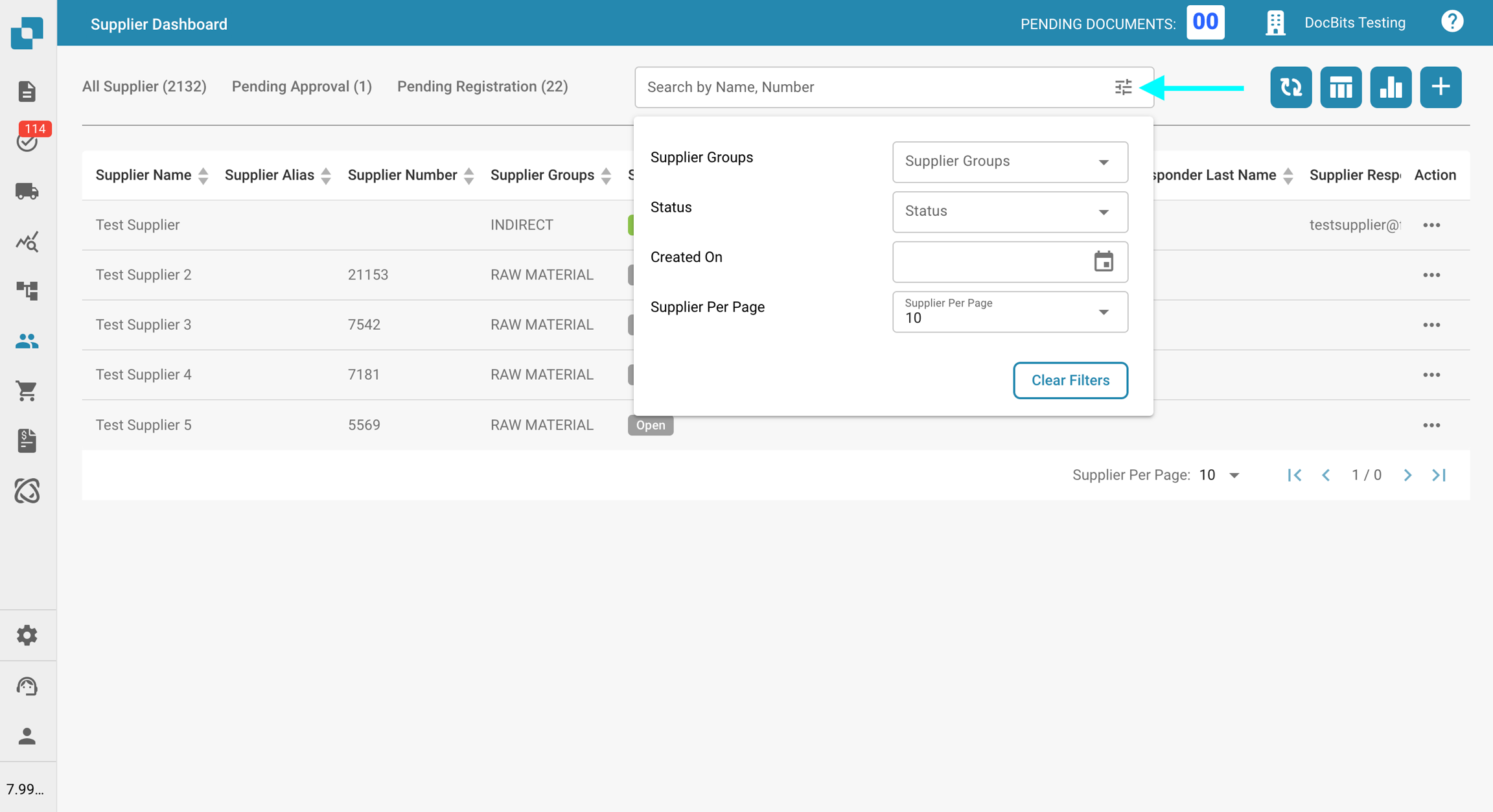 Puoi cercare fornitori per Nome o Numero, oppure utilizzare i filtri avanzati per restringere i risultati per: