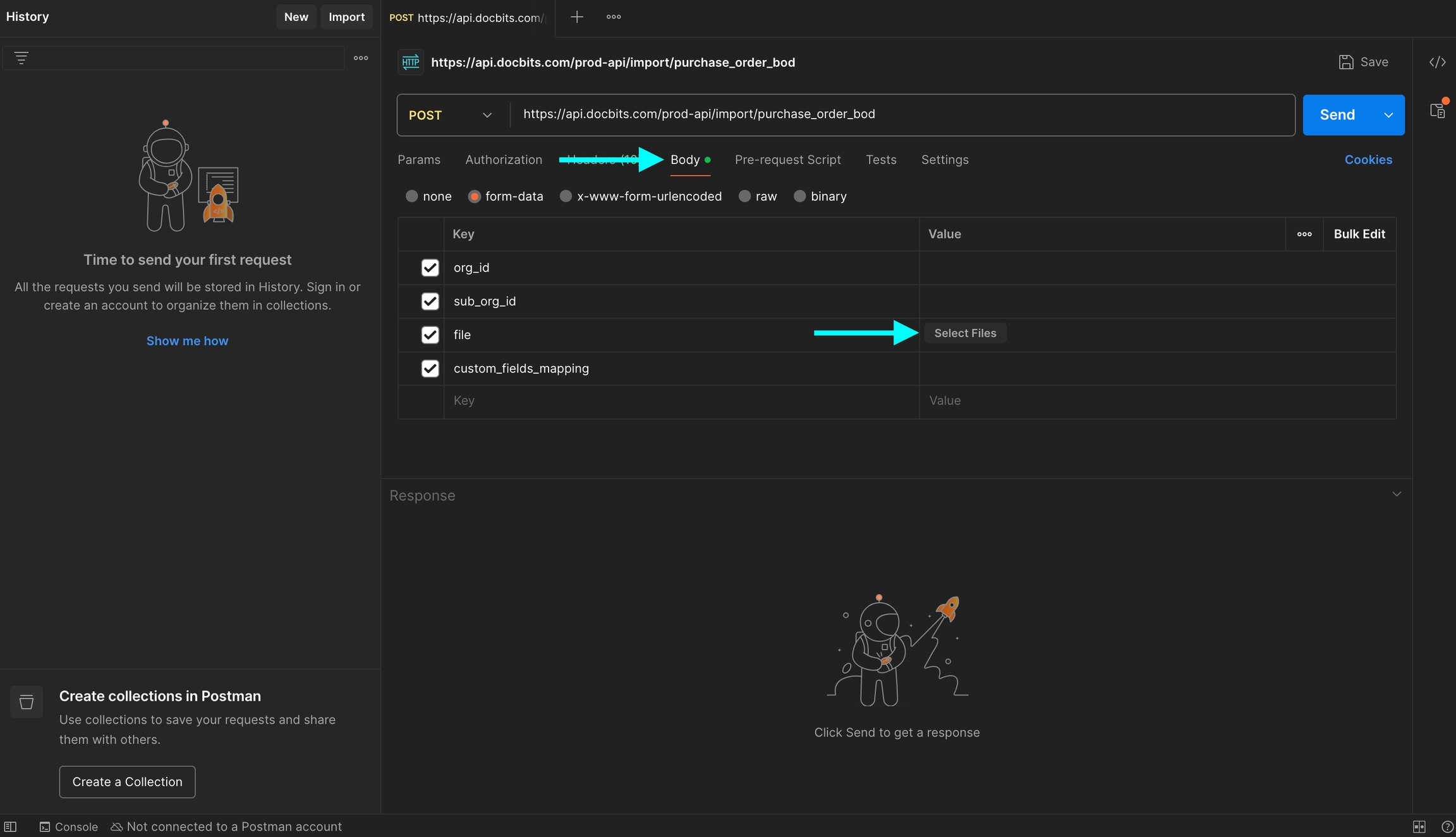 curl -X 'POST' \ 'https://api.docbits.com/prod-api/import/purchase_order_bod' \ -H 'accept: application/json' \ -H 'X-API-KEY:' \ -H 'Content-Type: multipart/form-data' \ -F 'org_id=' \ -F 'sub_org_id=' \ -F '[email protected];type=text/xml' \ -F 'custom_fields_mapping='