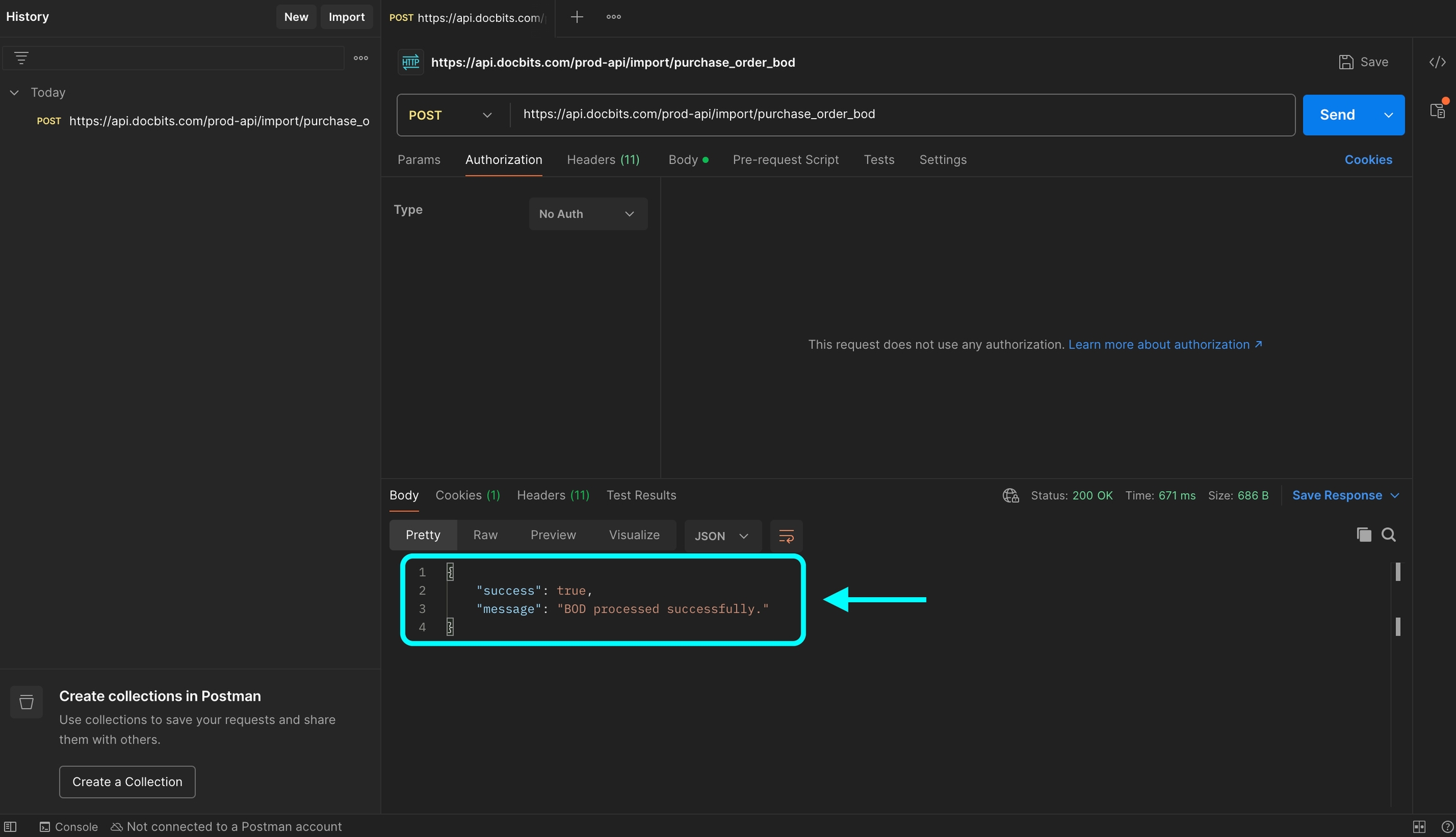 Verifica la Risposta Controlla la risposta per confermare che il tuo BOD sia stato elaborato con successo.