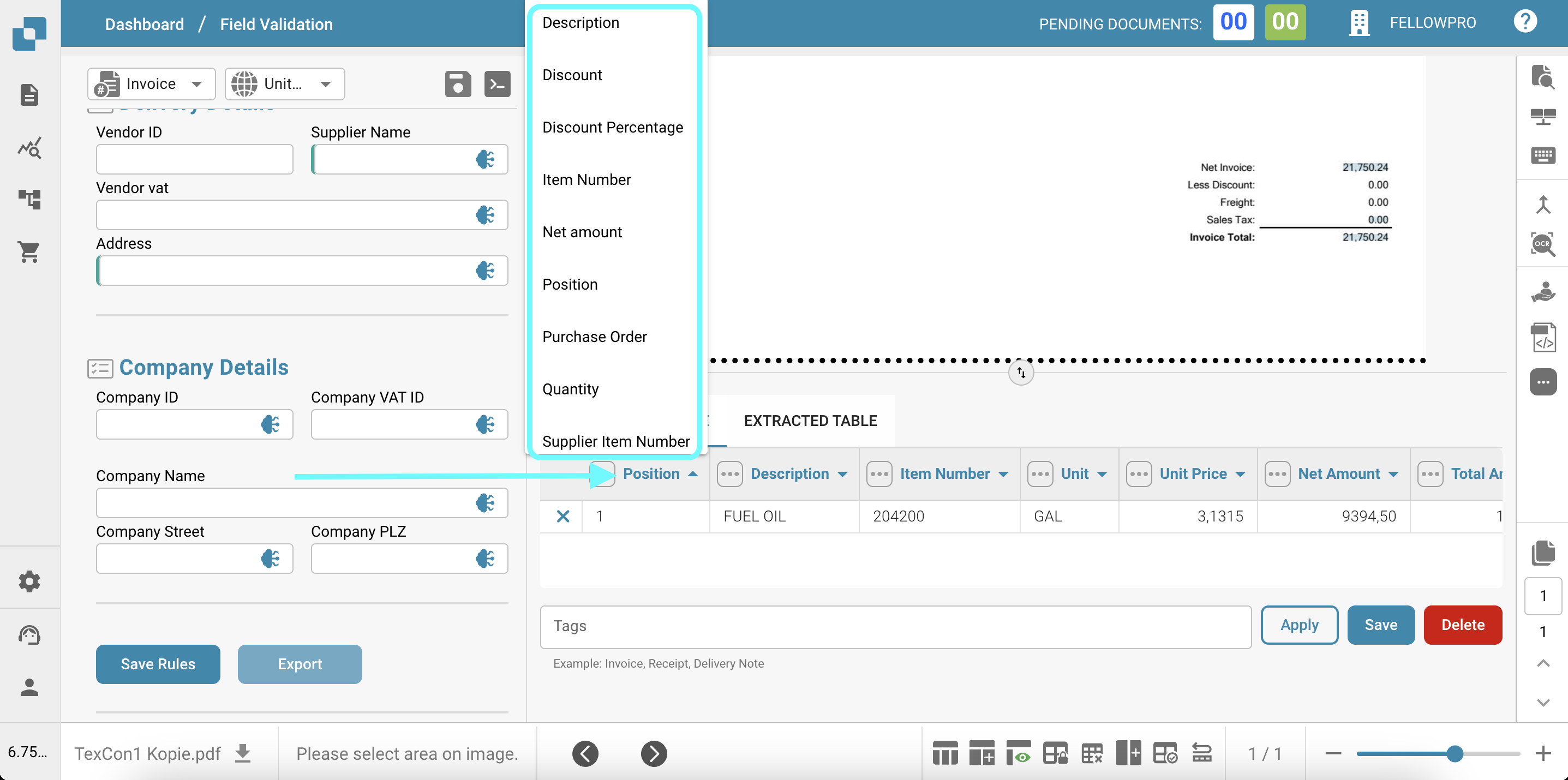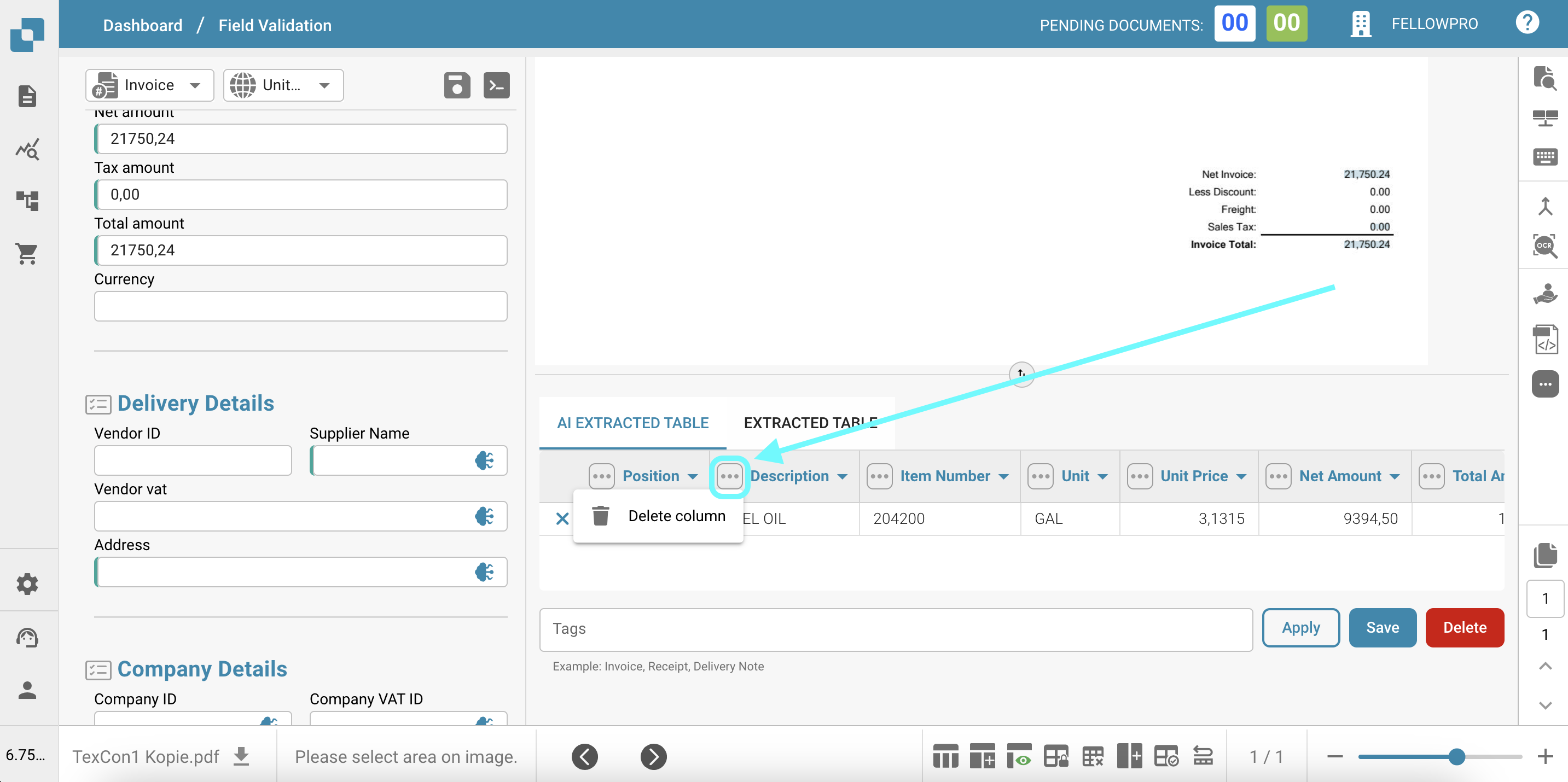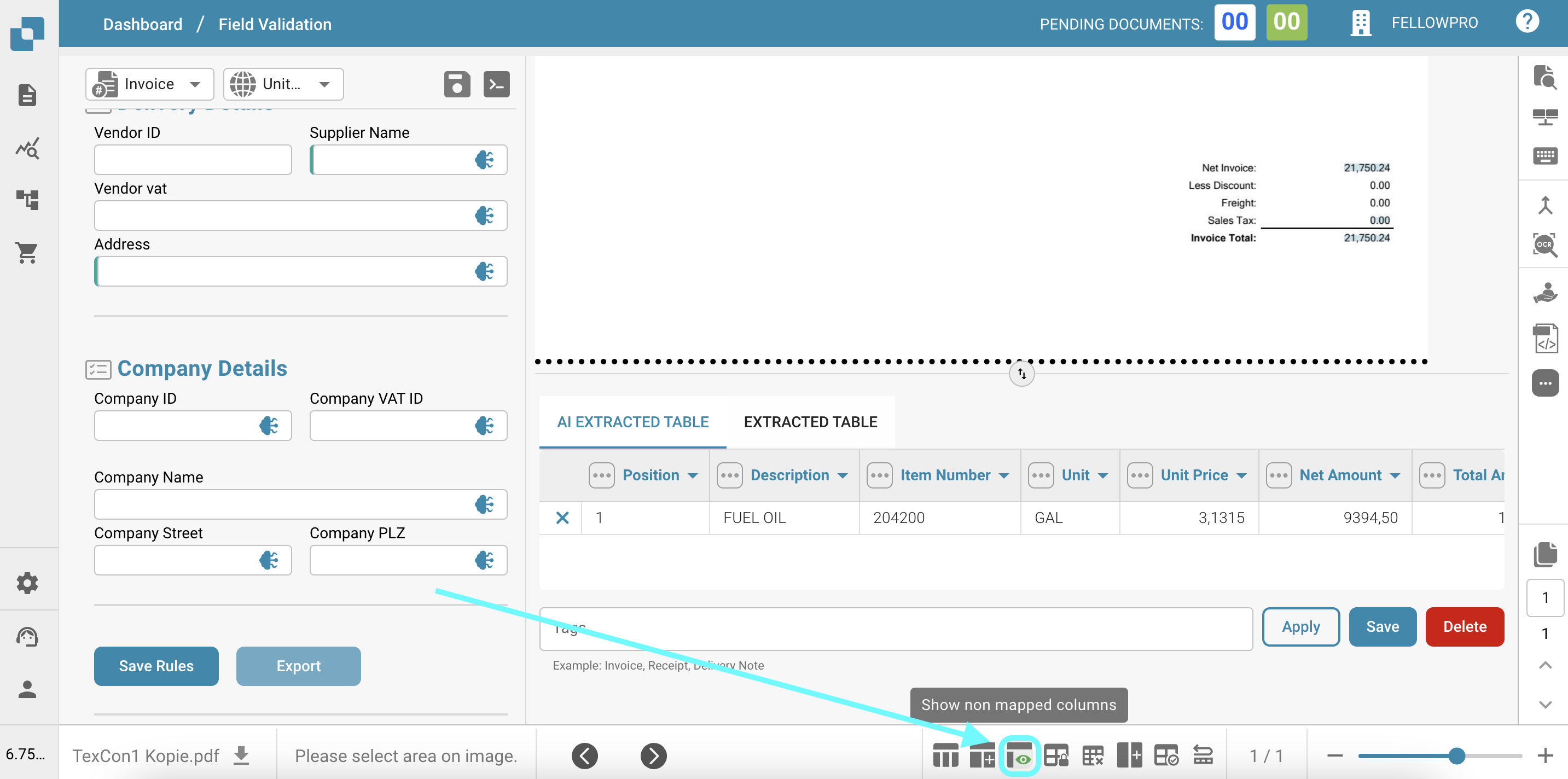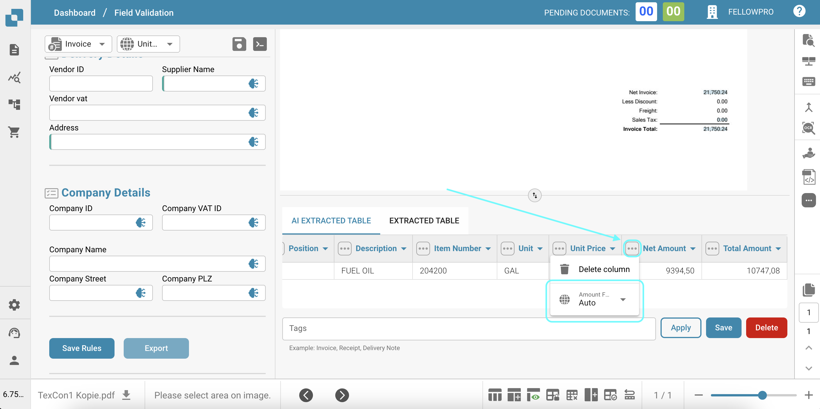 La funzionalità Tabella Estratta dall'IA consente agli utenti di manipolare e personalizzare facilmente i dati estratti dal documento della fattura. Ecco le principali capacità e istruzioni sull'uso: