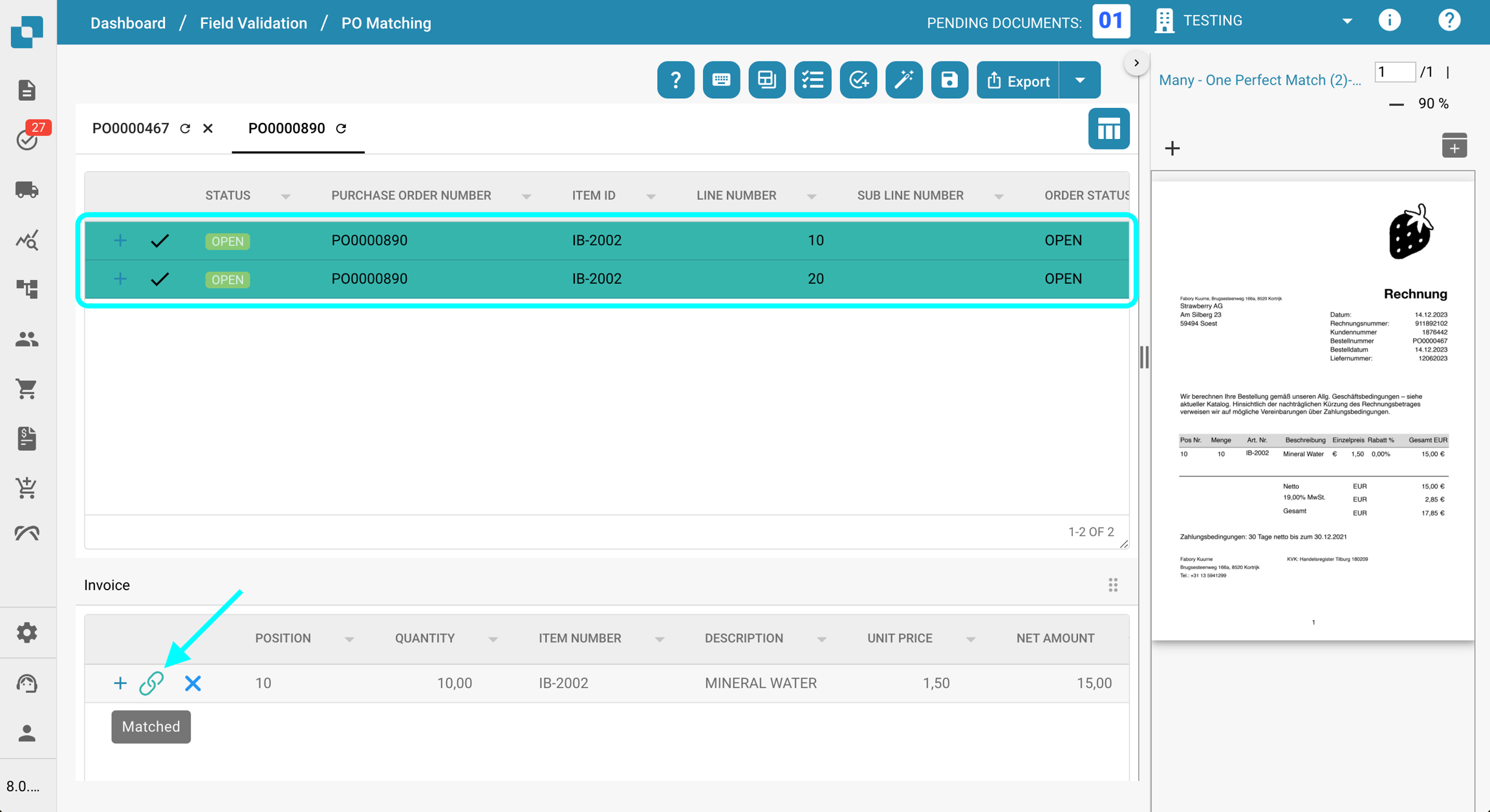 Dopo aver abbinato tutti gli articoli e convalidato la loro correttezza, puoi esportare il documento facendo clic sul pulsante Esportazione nella barra degli strumenti.
