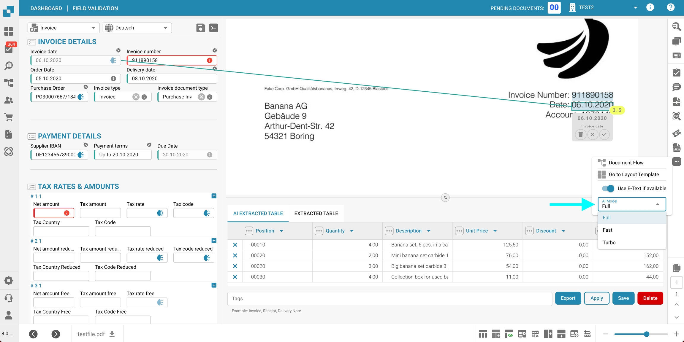 Nella sezione degli strumenti della Schermata di validazione, puoi scegliere il modello di IA utilizzato per l'Estrazione dei campi e l'Estrazione delle tabelle. Il modello di IA selezionato viene applicato solo a tutti i documenti del fornitore corrente.