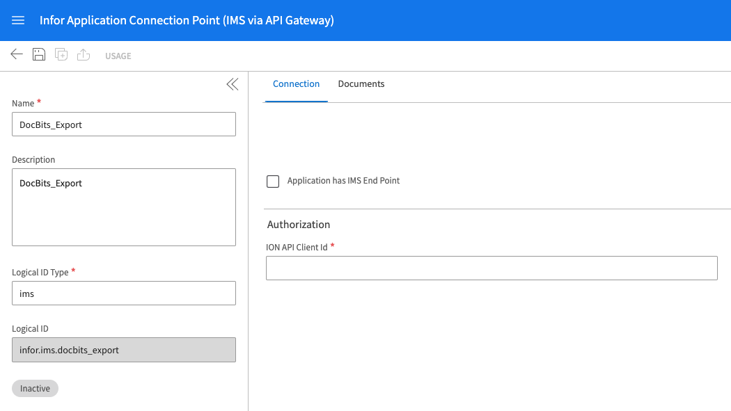 ION Mapping File: È possibile trovarlo in Infor OS → API Gateway → Authorized Apps. Cercare l'applicazione DocBits, aprirla e scaricare le credenziali.
