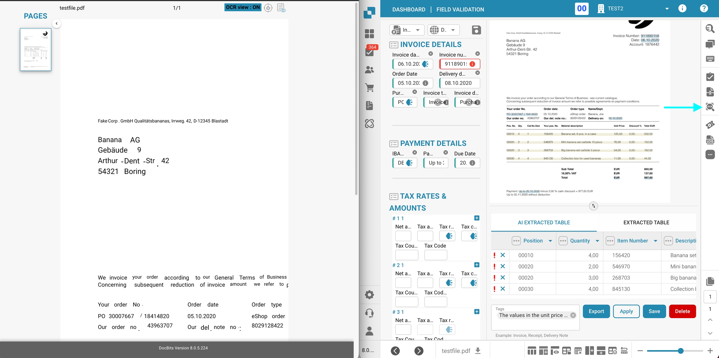 Aggiunto accesso utente ai risultati di estrazione OCR: Il pulsante Vista OCR nella schermata di convalida dei campi è ora disponibile per tutti gli utenti che hanno accesso alla convalida, anziché essere limitato agli amministratori. Con questo aggiornamento, qualsiasi utente autorizzato può rivedere direttamente i risultati di estrazione OCR, facilitando la convalida dell'accuratezza dei dati e il monitoraggio delle prestazioni complessive dell'OCR. Questo miglioramento promuove una maggiore trasparenza e migliora l'efficienza del flusso di lavoro di convalida.