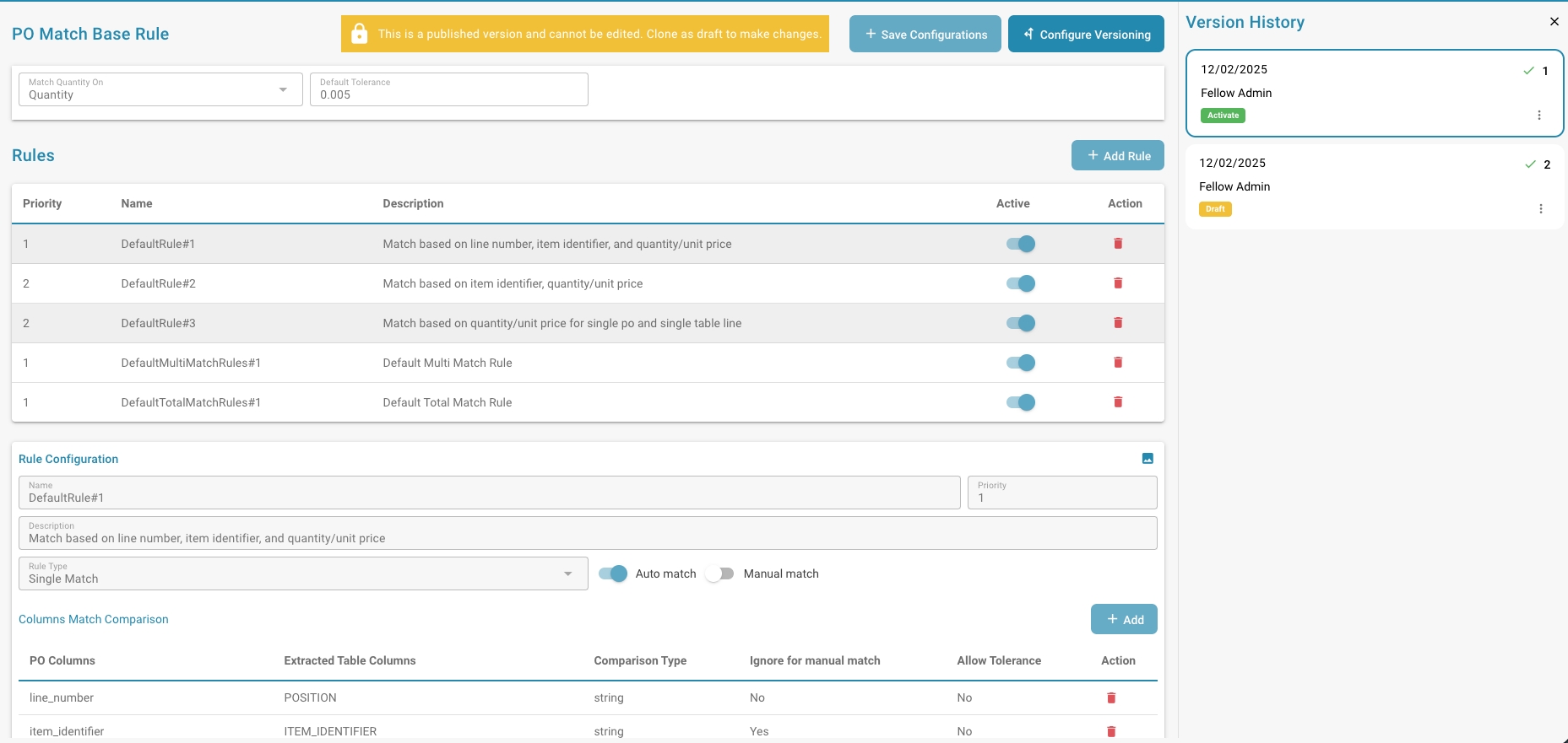 Personalizzazione avanzata delle regole di corrispondenza ordini: DocBits ora fornisce un controllo più granulare e personalizzabile sulle regole di corrispondenza degli ordini di acquisto. Gli amministratori possono configurare con precisione quali colonne devono essere valutate durante il processo di corrispondenza per ogni tipo di documento, assicurando che vengano considerati solo i campi più rilevanti. Inoltre, le tolleranze possono essere definite a livello di colonna, consentendo una maggiore flessibilità nella gestione di piccole discrepanze. Ogni regola può anche essere configurata per applicarsi alla corrispondenza manuale, alla corrispondenza automatica o a entrambe, offrendo ai team la possibilità di adattare il flusso di lavoro di corrispondenza ai loro requisiti operativi esatti. Questi miglioramenti migliorano significativamente l'adattabilità e la precisione del processo di corrispondenza degli ordini di acquisto.